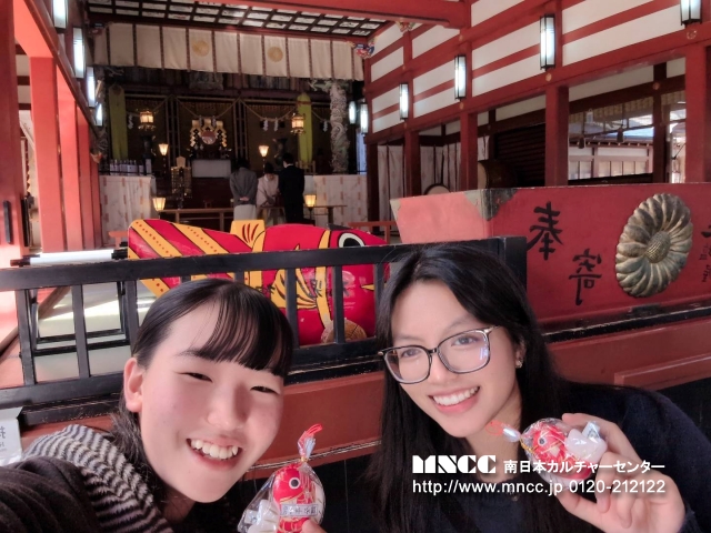 Today was my first day with さべっとう family! I had so much fun today!!! For breakfast, Shiori’s mom made eggs, sausage, and rice. It was so good!! Next, we went to 7-11. There was so many christmas decorations it was so cute! I got カルピス and it was yummy. After we went to Kagoshima Jingu and it was really pretty! There was a huge horse it surprised me! I got to feed it too. After we went to a delicious udon shop and I ordered かけうどん!! So delicious!!! After that we visited Senganen. It is such a beautiful place! It had lots of flowers and a beautiful historical traditional home. Shiori, Yuuka, and I made rings and a keychain out of glass. It was a lot of fun! After that we tried archery. It was difficult at first, but I was able to hit the target 2 times! We also wore kimono and took pictures!! The kimono was so pretty, It was an amazing experience. I also bought a few souvenirs for myself, family, and friends. I was a bit tired after our adventures so we went home after visiting Senganen. Today was great and I had so much fun! Tomorrow will be my first day of school… i’m so nervous!