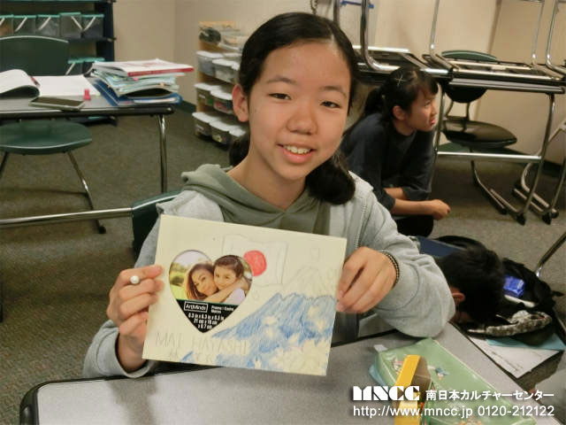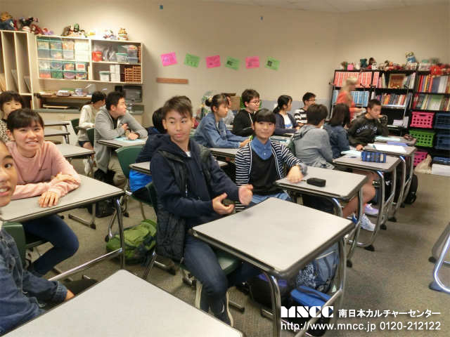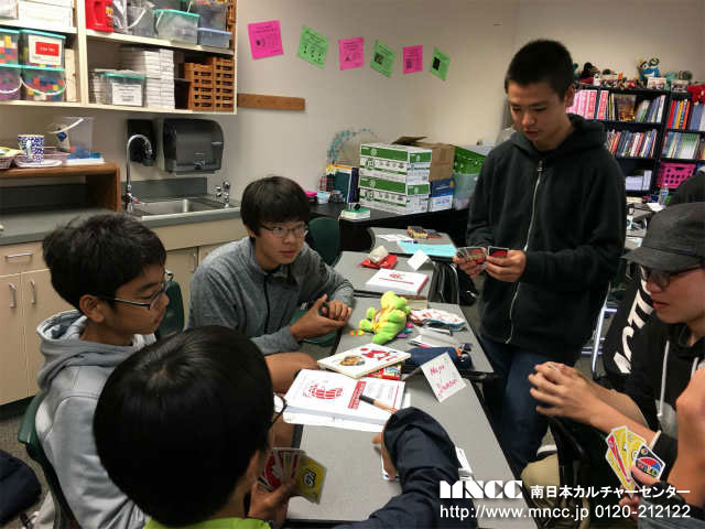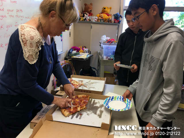 今朝もArlingtonは霧。昨日よりも霧が濃く、学校へ向かう途中も視界がとても悪く、すごく寒い朝になりました。寒いので生徒たちは、すぐに教室に向かいましたが、昨日、新しいホストファミリーの家に移ったM.M.さんの写真を見て盛り上がっています。みんな、興味津々。「どんなおうちだった?」と、質問攻めです。とても大きな家で、M.M.さんの部屋の写真を見るとホテルのような部屋でした。また、バックヤードには馬3頭それぞれがゆったりと過ごせる広場が広がり、とても大きな家でした。家族もとても優しく、素敵な家族だったようです。もう1人、新しいホストファミリーの家に移ったS.K.君は、向かいに住んでいるN.M.さんと一緒に登校してきました。彼の家には、3人のわんぱく少年がいて、とてもにぎやかな夜を過ごしたそうです。また、大好きなコーヒーをホストファミリーが持たせてくれ、すごく嬉しそうでした。 早速授業開始、いつものようにJournalから始まりました。今日も、みんな、KarenとJanellからのコメントを一生懸命読んでいます。今日のQuestionは、Q1. What did you learn the Mayor? Q2. Name 5 things you liked about your trip to Police Department or Mayor office. 黙々と書いています。最年少のK.N.さんは、私のところへ来て、「先生、今日はいつもよりもたくさん書いたよ~。いっぱい書けた!!」と、すごく嬉しそうに持って来てくれました。私も、彼女の成長に、また、嬉しそうにJournalを持って来て見せてくれる姿にとても嬉しくなりました。Karenも“Good Job!!”と、すごく褒めてくれました。その後、みんなの様子を撮っていたのですが、突然、写らなくなり、カードがエラー。買ったばかりのSDカードが壊れてしまいました。すごくショック!! 今までの写真のデータをパソコンに保存していたので、良かったですが、今朝の1時間目の授業の様子の写真がありません。2時間めからの写真になります。2時間目は“Discrimination”“Disagreement”の単語の中から英単語を見つけるゲームを、2つのチームに分かれて勝負します。単語を多く見つけたグループの勝ちです。もちろん、辞書は使ったらだめ。はじめ、スムーズに見つけていた単語も、後半になると、難しい。みんな、真剣勝負です。でも、いっぱい単語を見つけていました。負けたチームはとても悔しがり、もう一回したいと申し出ましたが、今日はここまで。少し休憩した後、ホストファミリーへのメッセージカードを作成します。 そこへ、酒井さんと、南日本カルチャーセンター代表の濱田さんとその息子さんが、会いに来てくれました。酒井さん、濱田さんと久しぶりの再会に、生徒たちもとても嬉しそう。 濱田さんの息子さんが、N.Y.君とみんなが似てると気づき、2人は自己紹介。今日の服装まで同じでした。みんな、再開に喜びつつ、ホストファミリーへのメッセージを、これまでのことを振り返りながら一生懸命書いています。 メッセージカード作成は途中ですが、みんなお待ちかねのピザが届き、Pizza Partyのスタートです。まず、Karenからスピーチがありました。“みんな、一生懸命頑張りました。とても良いグループでした。いつもは25人と大きなグループですが、今回は20人ちょうどいい人数のグループで、良いメンバーでした。あと数日しか残っていませんが、残りの日を楽しく過ごしましょう。それじゃー、Pizza Partyを楽しもう”の声かけに、みんなアメリカンサイズの大きなPizzaの写真撮影。とても、大きなピザが5箱。1人、チーズが苦手ということで、別注文のピザを食べましたが、昨日注文した後に、「サンドイッチのチーズは食べれないけど、ピザのチーズは食べれるよ」と知ることができたので、チーズなしのピザを何人かでシェアして食べていました。彼は、他のピザも美味しく食べていました。3ピース食べた人もいましたが、みんな育ち盛り、たくさんあったピザはあっという間になくなりました。全く足りません。みんな、もっと食べたかったようです。しばらく、休憩したあと、午前中の続きです。 メッセージカードに折り紙できれいにデコレーションする生徒や、色とりどりの絵を描く生徒、ホストファミリーの絵を描く生徒、みんな素敵なメッセージカードを作ることができました。 明日は、最後のFull day Trip!! シアトル市内に行きます。帰る前に、KarenとJanellから諸注意がありました。「4人かそれ以上の人数で行動して下さい。何かあったときのために渡したカード(KarenとJanellの電話番号が書かれています)を忘れずに持っておくように。とても人がいっぱいいます。危険もあります。貴重品はしっかり各自持つようにしましょう。置き忘れたりしないように!!」とありました。お互い声をかけ合って、楽しく過ごしてほしいです。ワシントン大学(特に図書館)、スタバ1号店、Pike Place Market。大都市シアトルを明日は満喫してきます。
