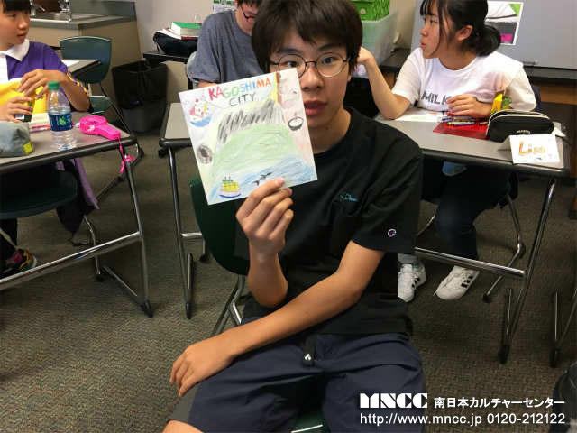 ちょっと早いですが、11:00~12:00までLunch Time!! 今日もみんな美味しそうなサンドウィッチや果物、ドリンクにスナックを持って来ていました。N.K.君が「先生、これ食べる?」と、持って来たクッキーを今日も私に分けてくれました。私はそのクッキーが大好きなので、美味しくいただきました。そして、S.K.君が“やっぱり、日本の弁当って素晴らしいんですね。日本の弁当が美味しい”とつぶやきました。そうですね、アメリカのLunch Boxと日本の弁当を比べると、全然違いますね。林檎1つと、チーズだけのLunch Boxもあれば、クラッカーにチーズを挟んだだけのLunchもあります。彼は「親に感謝しないといけない」と言っていました。みんなで食べるランチも4日目。4日目ともなると、みんな仲良し。男子も女子もお互いの弁当をシェアし合って食べていました。その後、30分はカフェテラスの隣にあるバスケットコートでバスケット、バレーをしてリフレッシュしていました。今日は、とても天気が良いので、半袖で十分。生徒たちは、きれいな青空の下で、思いっきり楽しんでいました。 午後はCultural Exchange Art Projectです。それぞれの出身地を紹介する絵を描きました。生徒たちは、地元にまつわる特産物や、名所などを上手に描いていました。このカードはQuiltのように、みんなのカードを合わせて、Sayonaraパーティーまで教室に飾っておくそうです。そして、Sayonaraパーティーでホストファミリーにプレゼントします。今日はここで、授業は終了です:14:30にはホストファミリーが迎えに来て、初めて週末をすごします。