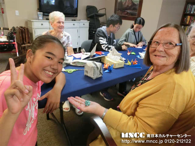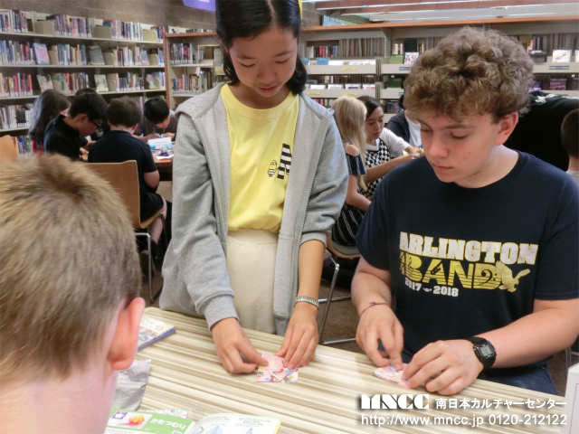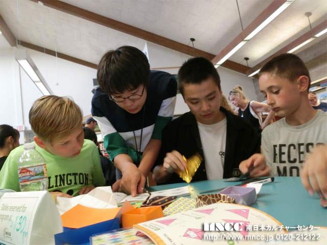 Lunch終了後は、近所にある図書館へ、子どもたちに折り紙を教えに行きます。その前に、図書館へ行くまでの1時間弱、2時間目の続きです。それも終わった人は、今日の分の日記を書いていました。そして、荷物を全て持って、歩いて5分のところにあるCity Libraryに移動です。図書館はそんなに大きくはありませんでしたが、色々な本がありました。日本の漫画、コナンも置かれていて、生徒もびっくり。地元の子どもたちが来るまで、折り紙の準備や図書館内を散策しました。続々と地元の子どもたちが来はじめ、生徒たちは、一生懸命、鶴の作り方を教えたり、本を見ながら、おひな様の作り方を教えたりしていました、はじめは、私や、途中から来てくれた酒井さんに“どう言ったらいいの”と、聞いてきましたが、しばらくすると生徒たちは自分たちで、地元の子どもたちとコミュニケーションを取り始めました。小さい子には一緒に折ってあげたり、ゆっくり丁寧に教えていました。逆に、地元の子どもたちから、手裏剣の作り方や、孔雀の作り方(私も作ったことがない)を教えてもらっている生徒もいました。あっという間に1時間半がたち、終了の時間です。Karenが“Clean up”と何度も言っていましたが、生徒たちと子どもたちは夢中になり、なかなか終わることができませんでした。子どもたちは自分たちで作った折り紙をとても、大事そうに両手いっぱいに抱えて帰っていきました。今日はこれで、私たちの一日のスケジュールも終わりです。何人かのホストファミリーはすでに図書館に迎えにきてくれていました。あるホストファミリーが、参加していた子どもの保護者に、このホームステイのプログラムの話をしていました。すると、この保護者は、来年、自分もやってみたいと、酒井さんに申しでていました。そう言ってもらえると、凄く嬉しいですね。