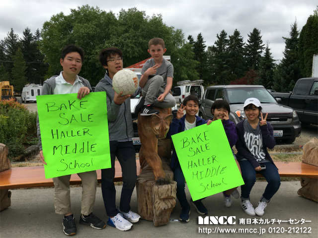 “Bake Sale Haller Middle School”と書かれた大きなサインボードを持って、4つのグループが4カ所に分かれてドライバーに向かって、Bake Saleと大きな声で呼びかけます。みんな初めてする、ドライバーさんへの呼びかけ、とても大きな声で、楽しそうにしています。少し近所迷惑かなと私が心配するぐらいでしたが、Karenは“That’s great!!”と、すごく褒めていました。しばらくして、第一号のお客さんは、課外授業のため今日登校したお姉ちゃんをHaller Middle Schoolまで送りに来た親子です。男の子は早速、N.Y.君が持って来たけん玉を買ってくれました。そして、昨日、図書館で一緒に折り紙を作った男の子も買いに来てくれました。そこで、みんなのテンションはさらに上がり、一生懸命呼び込みをしています。中には、踊りながら、ドライバーに向かって“Bake Sale”と言っている生徒もいました。
