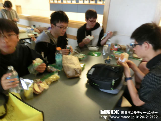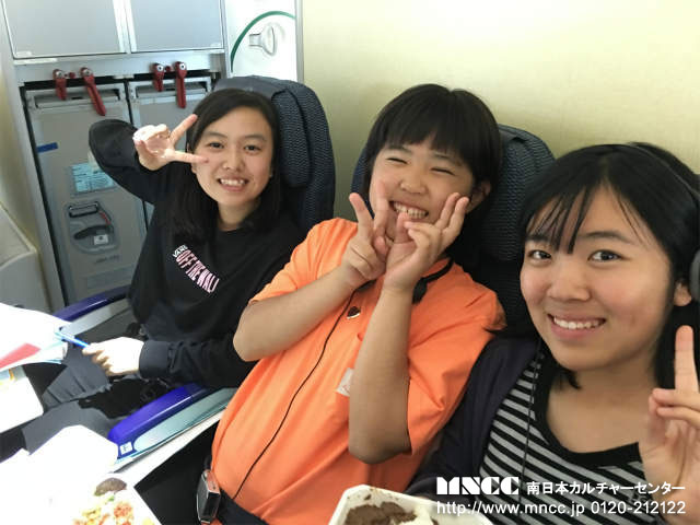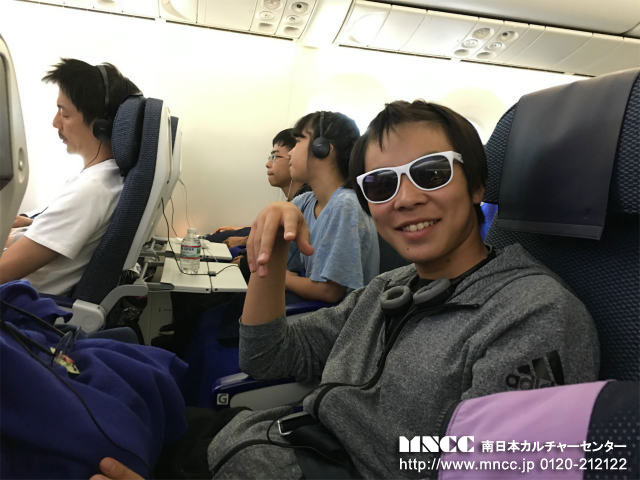 羽田に到着すると、南日本カルチャーセンターの代表の濱田さんと、今回シアトルまで同行してくれる酒井さんが笑顔で迎えてくれました。そして、鹿児島、佐賀、福岡の10名と合流して、成田空港へ向けて出発。途中、東京の高層ビルを見て驚き、Disney Landを通りすぎ、みんな大興奮。成田に到着後は小学生3人ともお別れです。成田空港では酒井さんの誘導の元、搭乗手続きを無事に済ませることができました。しかし、トラブルもありました。羽田空港でスーツケースのストッパー?がなくなり、ネジがむき出しの状態!! 酒井さんが空港の方と話し、保険で直してもらえることになりました。その後、16:30までの2時間は自由行動。お昼がまだだったので、各自でお昼ご飯。沖縄の生徒、鹿児島、佐賀県の生徒たちは今日初めて顔を合わせたと感じさせないぐらい、とてもなじんでいました。おしゃべりしながら、集合時間までまったりと過ごしました。16:30、酒井さんからの諸注意のあと、グループに分かれて自己紹介&Sayonara Partyの出し物についての話合い。ダンスやマジック、ボイスパーカッション、ドラム、ピアノ、習字などたくさんのアイディアを出してくれました。その後はお互いの名前を覚えているかチェック!! Group Aの班長S.K.君が初めに挑戦してくれました。Group Bの班長N.K.君、Group N.S.君、最期にGroup DのC.K.さんがパーフェクト!!全員の名前を言うことができました。 なんと! 機材の入れ替えで搭乗時間が遅れ、19:20にやっと飛行機へ乗ったけど・・・なかなか飛ばず、19:47離陸しました。そこから約9時間の飛行機の旅です。機内では、それぞれドラマを見たり、映画を見たりして過ごしていました。オリエンテーションで福島さん、出発前に酒井さんから、「飛行機では眠りなさい」とアドバイス通り、みんなしっかり寝たそうです。もちろん、機内食(dinner→シーフードのトマトソース煮込み or とんかつの卵とじ丼、breakfast→パンケーキ or 三色そぼろ丼)も2回美味しくいただきました。途中デザート(おやつ)のケーキも出たそうですが、私は熟睡で気づかず食べそびれてしまいました。