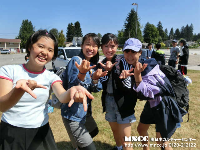 今日は朝から良い天気、暑くもなく、寒くもないちょうど良い天気!! ピクニック日和の素敵な朝。みんな、今日も元気に登校。今日は授業がないので、ランチボックスと水筒など、身軽で登校です。今日は、終日Full Day Trip!! カナダとの国境にある、Peach Arch と Birch Bayを目指します。 8:10全員集合。バスに乗り、学校から約1時間のところにある、カナダとの国境沿いにある、Peace Archに向かいます。バスの中では、みんな朝も早いから、爆睡かなと思ったら、大間違い!! みんな楽しくおしゃべり。あっという間に、Peace Archに着きました。「先生、なんで、あそこのおうちにはカナダの国旗があるの?」と何人かの生徒が質問。すると、公園の目と鼻の先にある、芝生の公園の向こう側の道路からは、『カナダ』だそうです。日本では、得に沖縄の人にとっては県境もなければ、国境も陸続きではないので、みんなびっくり。「えっ!! すぐ、カナダにいけるさ~」と、みんな、向こう側の家の撮影会。公園を下って行くと、アメリカとカナダの国境があり、多くの車がアメリカ→カナダ、カナダ→アメリカへと横断していました。国境には大きなアーチがあり、アメリカ側には、きれいに咲いた赤、白、青の“アメリカの国旗”を表した花壇、カナダ側にも、赤と白のきれいな花で表された“カナダの国旗”の花壇がありました。色とりどりの花が咲いていて、とてもきれいに整備された公園をしばらく散策し、アーチをくぐります。アーチの内側には、2つの国が平和で結ばれていることがわかる「May these gates never be closed」と刻まれていました。みんなでアーチをくぐり、横一列に並んで、カナダ側にジャンプ!! カナダの国旗の歌壇の前で記念撮影。今日は、初めて会う南日本カルチャーセンターの下畝さんが写真を撮ってくれました。すると、Stanwoodとあと1つのグループも来ていました。しばらく散策した後、また30分ほどバスに乗り、Birch Bayへ向かいます。 Birch Bayに着いて、みんな、お待ちかねのLunch Time♪ 今日も、賑やかなLunch Timeです。今日はKarenとJanellも一緒にランチ!! お互いが持ってきた弁当をシェアしながら、楽しくLunch Time♪ その後は、グループに分かれて宝物探しのようなゲーム、“Beach Scavenger Hunt” をしました。一位のグループには商品があります。「チャーリーとチョコレート工場」にも出てくるような、大きなチョコレートがもらえます。私もほしい!! 私もバケツとシートをもらい、海へ。Birch Bayは砂浜のあるビーチではなく、小石がゴロゴロあるビーチでした。それぞれ、バケツとそれぞれの項目が書かれた紙を持って、ビーチへGo。みんな、必死になって探しています。でも・・・難しい。“sand dollar”や“feather”、“Treasure”など、「そんなのどこにあるの~」と集めるのに悪戦苦闘。グループで考え、C.M.君のチームは「treasureは自分たちのグループのメンバーだ。先生、写真撮って」と!! 素晴らしい。自分たちを「宝」にしていました。また、N.M.さんのグループはガラスのボトルがないので、Bayを訪れていた地元の方々に、「持ってますか」と質問しにいきました。他のグループも、家族で訪れている人々のところへ行き、“Beach Toy”の写真を撮っていました。C.C.君は、5年くらい研究している「貝殻」採集もしながらの、Scavenger Huntです。Birch Bayに来る前から、「貝は持って帰ることができるの?」と聞き、目を輝かせながら、ゲームに取り組んでいました。私は、ここではじめて見た、“sand dollar”は鹿児島にもたくさんあるらしく、特別なものではないようです。それも、貝と思っていたら、ウニの一種だそうです。Janellが見つけてくれた“sand dollar”は「もろく、割れやすいから気をつけてね」と、せっかくもらったのに、終了間際、バケツをのぞくと、粉々に割れてしまっていました。So sorry, Janell. 集め終わったグループはKarenのもとへ行き、確認してもらいます。優勝は「N.S.君、N.M.さん、H.R.さん、M.M.さん、N.Y.君チームです」。どのチームも、楽しく、一生懸命探していました。Scavenger Huntの時間はたっぷり3時間ありましたが、なんと、すべてのグループが1時間で集め終わり、13時には終わってしまいました。この後、どうする?となり、「1ドルショップに行きたい」という生徒もいました、大型バスを停める駐車場がないということで、急遽、ショッピングモールへ。先週訪れたoutlet mallではなく、大きな複合型ショッピングモールです。Macy’s やTargetなど大きな商業施設があるmall.1時間半しかありませんでしたが、生徒たちは、とても楽しく過ごしていました。帰りのバスの中でも、みんな今日の疲れを感じさせないほど、にぎやかに男子も女子も一緒におしゃべりしながら、学校に向かいます。 ここで、今日のFull Day Tripも終わり。明日は、終日学校で授業と、ホストファミリーへのGiftづくりです