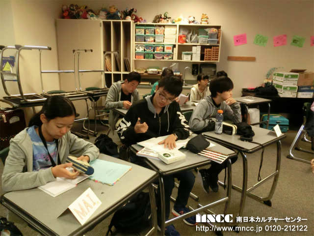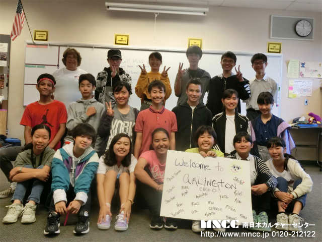 Arlingtonに来て2週目の月曜日の朝も、ものすごーく寒い!! TCのKarenも“とても寒い”と言うぐらい、冷えています。週末はとても天気が良く、すご~く暑くて、沖縄出身の私もTシャツ一枚で過ごせるぐらい。沖縄のように湿気はなくDryなので、日陰にいると涼しく、過ごしやすいArlington。そんな素敵な天気のもと過ごした初めての週末が終わり、みんな今朝の寒さを感じさせないほど笑顔で登校です。登校してしばらく教室に入らず(車から降りてすぐ)に、週末の出来事を話し始めました。教室に入っても、お互いの週末を話しています。そして、今日の初めの授業はこのQuestionからスタートしました。Q1. What did you do 1st weekend? Q2. How is the Arlington’s weather different than Japan? 辞書を使いながら、分からない表現はKaren と Janellに聞きながら、一生懸命書いています。手が止まっていると、Karenの檄が飛びます。“Keep writing!!”書き終えると、週末の出来事を1人ずつ発表です。--キャンプに行ったよ。--アラジンを見に行った。--ライオンキングを見たよ。--シアトルまで行って、スペースニードルに上ったよ。--モールに買い物行ったよ。--肉じゃがを作って、ホストファミリーと一緒に食べたよ。--日本食がたくさん売っているスーパーに連れて行ってもらったよ。など、みんな色々なところへ連れて行ってもらい、凄く充実した週末を過ごしたようです。ホストファミリーの皆さんに感謝ですね。普段できないこと、日本にいたら食べることができない大きなピザやステーキなど、皆さんが楽しく、またたくさん笑って過ごせるように色々な計画を立ててくれています。スーパーに連れて行ってもらったときには、食べてみたいお菓子や、飲んでみたいドリンク、朝ご飯で食べてみたいシリアルなどを買ってもらい、すごく温かいおもてなしを受けているなあと感じます。また、日記を読むと、ホストファミリーだけでなく、ホストの親戚や近所の方々など、多くの人たちと交流があったようです。ホストのおじさんの誕生日に行った、C.C.君とN.S.君はたくさんの人が集まったBirthday Partyにすごく驚いたようです。また、N.Y.君の日記にこんなことも書かれていました。「アメリカの人たちは、知り合いでもないのに、あいさつしたり、普通に会話をしていることが凄いと思った。コミュニケーションの高さに、さすがだなと思った」と書いていました。KarenもJanellもそうですが、スーパーへ行っても、ショップの店員さんも、みんなフレンドリー。お互いの事を知らなくても、“Hi, how are you doing today?”から、世間話が続きます。日本ではあまり見ない光景ですね。