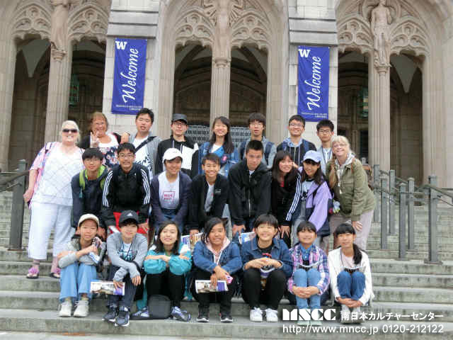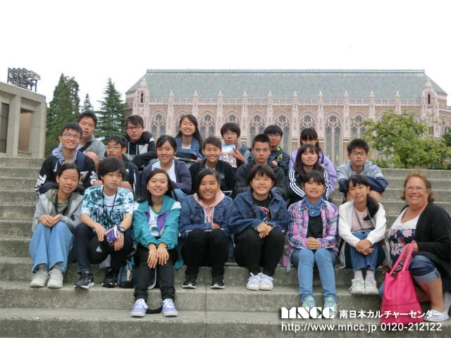 今日は、みんなが楽しみしていたSeattle観光の日です。いつものようにArlingtonは朝は冷え込んでいます。今日は、Seattle Centerでランチを買って食べてもいいし、ホストに作ってもらってもいいよということでしたが、ほとんどの生徒がランチを持って来ていました。一昨日から新しいホストファミリーの家に移動になったM.M.さんのランチバックがとても大きい。バスに乗る前に、ランチバッグをのぞいてみると、サンドウィッチ、ゼリー、果物、スナック2種類、ヨーグルトにドリンク!!たくさんランチを準備して持たせてくれていました。彼女は昨日、馬のブラシングを双子のホストシスターと一緒にやったそうです。とても楽しかったと言っていました。U.T.君、I.Y.君、N.K.君は3人で昨日の夜、昨日の夜サンドウィッチを作って持って来たそうです。 バスの運転手さんから、「シアトルまで渋滞しているから数時間かかるかもしれないので、学校でトイレを済ませてからバスに乗るように。バスに乗っている間は、席を立たない、窓を開けないように」と諸注意があった後、8:10学校から出発です。今日はN.K.さんとC.K.さんのホストマザーも一緒にシアトル観光へ向かいます。 Famous University of Washington ~Visit the Library~ バスの中では、みんな楽しそうにおしゃべりしながら過ごしていると、1時間弱でワシントン大学に到着です。思ってた以上に、渋滞ではなかったので良かったです。ワシントン大学はとても広く、建物もとても素敵です。そこら中に、きれいに手入れされた花壇があり色とりどりの花が咲いています。 それぞれの学科別の棟に名前が着いているようですが、発音しにくい!! Karenも発音できないと言っていました。到着してすぐに、図書館へ出発です。何人かの生徒はすでに、インターネットでワシントン大学の図書館を調べてきていましたが、ハリーポッターに出てくるような図書館です。図書館経向かう途中多くの学生さんに会いました。彼らはIDと大学のロゴのあるナップザックを持っていて、9月に入学する生徒のオリエンテーションを学生が案内して回っているそうです。生徒はアメリカの生徒だけでなく、国際色豊かでした。もしかしたら、日本の学生さんもいたかもしれません。図書館の前で記念撮影。私たちの前に、Stanwoodのグループが写真を撮っていました。今日は、私たちグループの他に沖縄から来た、Stanwood、Puyallupのグループ(他にも2つのグループ)も、終日シアトル観光だそうです。図書館に入る前に、Karenから「絶対大声を出さないこと。静かにすること。なかでは、サマーキャンパスが行われていて、勉強している生徒もいます。静かにしましょう」と、諸注意がありました。みんな、静かに図書館に入りました。入るとすぐ、コーヒーの良い匂い。入り口右側には、とても広いスターバックスがありました。大学の図書館内のスターバックス。とてもおしゃれです。奥行きがとてもあり、1階の奥は、普通の図書館。2階へ続く階段が、また素敵で、階段に座って記念撮影。そのあと、ハリーポッターに出てくるような図書館へ向かいます。学生さんたちグループのオリエンテーションと交代で見学です。中に入ると、素敵な空間になっていました。生徒たちは、椅子に座って本をめくってみたり、本棚の本をのぞいたりしていました。天井も高く、ガラスはステンドグラスになっていました。歴史を感じる、とても趣のある図書館です。ここなら、テスト勉強も集中できそう!? その後は、大学内にある、噴水広場に移動です。そこに向かう途中にもたくさん木が植えられていて、噴水へ向かう通りとはとは反対側は、両サイドに桜並木になっているそうです。シアトルの人々は春に咲く、サクラの花がいつ咲くのか楽しみに待っていると、Karenが言っていました。私もその時期にもう一度訪れてみたいです。噴水の周りも、また素敵な花がきれいに咲いていました。そこでは、南日本カルチャーセンターの、酒井さん、下畝さん、代表の濱田さん親子が待っていてくれました。噴水前で記念撮影のあと、下畝さんから、今日のシアトル市内観光での諸注意がありました。昨日、KarenとJanellが言ってくれたように「貴重品は大事に持つように。お金は見せないように。盗まれるので気をつけるように。カバンは背中に背負うのではなく、前に持って歩くこと。大道芸人の写真を撮らないように。EMPやSpace Needleがある、Seattle Centerへ移動して、1時間弱のLunch Time。 今日は、ずっと曇り空。とても寒い。晴れていたら、EMPの壁が素敵に輝いていたかもしれません。Seattle Center内のフードコートで、各自Lunchタイム。M.M.さんのLunch、自分たちで作ってきた、I.Y.君、U.T.君、N.K君のサンドウィッチ、どれも美味しそうでした。もちろん、ここで買って食べている生徒もいました。日本では売っていない、スタバのドリンク。とてもきれいなピンク色。ドラゴンフルーツ味だそうです。K.N.さんは、スタバでドリンクを少しま