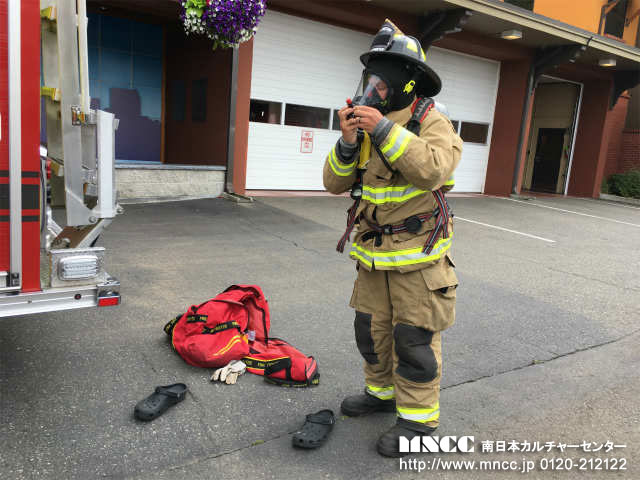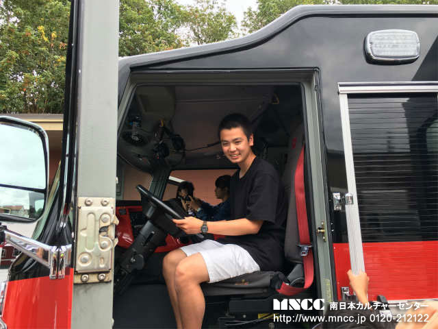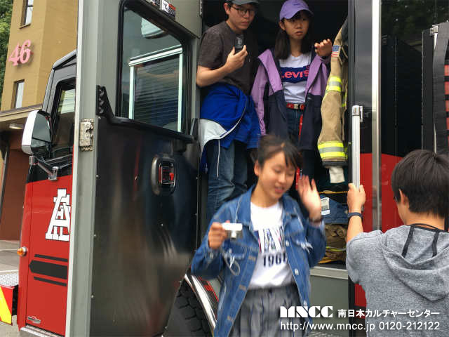 そして、午後は歩いて5分もかからない場所にある“Fire Station”の見学です。そこで、今日は解散になるので、みんなカバンを持って移動します。午後も曇り空ではありますが、少し暖かくなってきました。消防署に着くと、消防士さんが署内を案内してくれました。初めにキッチン。2日署内で過ごし、3日休んで、また仕事というシフトになっているようで、署内のキッチンで3食の食事を作って食べているそうです。8人の方が今日は働いているそうです。次にトレーニング室。色々な器具が置かれていて、そこで日々のトレーニング!! ここで、C.M.君に通訳をお願いしました。彼はみんなに、わかりやすく説明することができました。その後は、消防車両の見学。特別な車両、特別な用具、その中には医療器具も含まれていました。酸素ボンベを持たせてもらったのですが、とても重い。女子は1人で持てません。そして、山火事などがあったときに出動する消防車もあります。その特別車両は、カリフォルニアの山火事があったときも、要請があれば行くそうです。24時間ずっと管轄内だけでなく、管轄外の消防署とも繋がっていて、応援が必要なのか、モニターを見てチェックするそうです。外見はとても小さな消防署に見えましたが、とても奥行きがあり、外見の割に広い消防署でした。みんな、熱心に聞いて、写真を撮っています。外にある消防車に乗ってもいいよ言ってくれたので、生徒たちは大喜び。中に入り、ヘッドフォンを付けてみたり、運転席に座ってみたり、日本の消防車にもめったに乗ることができないので、とても貴重な経験をしました。K.N.さんは道路で消防車両が通るとき、前の車に合図を送る音をならしてごらんといわれ、ひもを引っ張ると、凄く大きな音。引っ張った本人が一番びっくりしていました。そして、とてもさびた鉄骨の説明がありました。2001年9月11日に起こった同時多発テロの世界貿易センタービルの一部だそうです。Arlingtonの消防士もボランティアで4人現地に行ったそうです。その後、1人1部屋(大学の寮のような部屋)ある2階の仮眠室や卓球やテレビを見て過ごすことができる部屋も見学させてもらい、気づいたら、もう帰る3分前。何名かのホストファミリーは迎えに来ていました。最後に消防車と消防士の方々と記念撮影をして、今日は終了になりました。 今週末もそれぞれのホストファミリーは計画を立てているそうです。C.C.君、N.S.君たちは、月曜日もお休みして、シアトルマリナーズの試合を見に行くそうです。ここで過ごす最後の週末。最後にホストファミリーとの時間を大切に過ごしてほしいこと、また、使わせてもらった部屋やお風呂場などの掃除などやるようにしましょうと伝えました。 月曜日に、どんな週末を過ごしたのか聞くのが楽しみです。Have a nice weekend!!