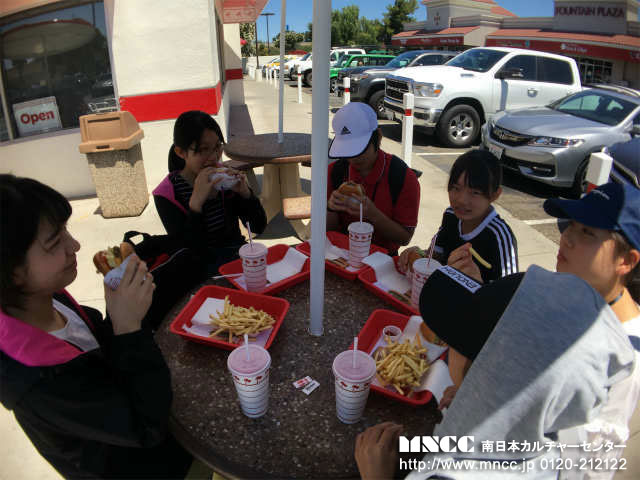 今日は初めての終日研修でした。8時に貸し切りバスに乗ってStudy Centerから出発しました。最初は、1時間以上かけてJelly Belly Factoryという工場に行きました。工場の話をする前に車窓から見えた景色のことをまず話しますね。 窓から見る眺めは広大で、全ての物が珍しく、研修生はバシバシ写真を撮っていました。中でも大きな風車に驚いたようでした。風車は1つでは無くたくさんで、それが同時にクルクル回る様は、「さすがアメリカ!」というものでした。熊本の研修生からは「阿蘇みたいだ!」という声が上がりました(もちろん、阿蘇よりも もっともっとすごかったですよ!!)。 バスにはホストブラザーやシスターも同乗しており、持参した折り紙で手裏剣などを作ってあげた研修生がいました。ホストシスター達は「Ninja star!(忍者スターだ!)」と喜びの声を上げていました。また、到着しバスを降り工場に向かう途中では、ホストシスターをだっこやおんぶしてあげている研修生もいました。ホストファミリーとすっかり打ち解けた様子が伺え、とても嬉しかったです。 さて、工場内は色どり鮮やかなかわいい感じのもので溢れていました。ここに来た目的は、Jelly Bellyと名付けられている小さな豆のような形をした色とりどりのキャンディー(グミ?)を作っている作業工程を見学するためです。「ここは日本なのか?」と思うほど整然としていて、衛生面もきちんと管理されているところでした。ただ、日本との違いは、とても遊び心で溢れていたことでした。Jelly Bellyで作られた有名人の似顔絵などが飾られたり、機械の上にマスコットキャラクターが乗せられていたりしました。また、ツアー見学者は必ずユニークな形の帽子をかぶらなければいけません。おそらく日本に無いタイプの工場なので、研修生にとって、とてもよい経験となりました。見学の後は、工場内でショッピングをしました。「何を買ったの?」と聞くと、ほとんどが日本にいる家族や友人へのお土産でした(お土産を楽しみに待っていてくださいね!)。 その後、バスで30分ほど移動して、Vacaville Premium Outletsという、とても大きなモールに行きました。Vacaville Premium Outletsとは、鳥栖のプレミアム・アウトレットをイメージしてもらうと良いかと思います。ここにはアディダス、ナイキ、コンバースなどの日本でも馴染みのお店や、TACO BELL(タコベル)という関東にしかないメキシコ料理レストランなど、100以上のお店が広大な敷地内にありました。到着直後にキャシー先生が「Please mak groups of 3 or more.(3人以上の班で行動しましょう)」「Please come back to the bus at 3:30.(3時30分にバスに戻って来ましょう)」「Don’t be late OK?(遅れないでください!)」と指示を出されました。研修生は全員大きな声で「OK」と返事をし、各自でそれぞれが見たいもの買いたい物があるお店へすごい勢いで向かいました。その勢いに圧倒されるとともに、英語にもだんだん慣れてきていることが分かり、研修生の成長を感じることができました。遅れをとった私は写真を取りに研修生たちの後を追いました。しかし、広大な敷地なのでなかなか見つけることができません。やっと見つけた研修生と話をしていると、MNCCの上吹越さんが3:30という数字を腕に書き留めているのを見つけられました。キャシー先生の指示を忘れないため腕に集合時間を書いていたのです!! 上吹越さんから「とってもいい研修生達ですね。」という最高の褒め言葉をいただきました。 買い物からバスに戻ると先に乗っていたキャシー先生から「Did you enjoy today?(今日楽しかった?)」と声をかけられました。答えは「YES!!!!」でした(もちろん大きな声と笑顔で)。ただ、帰りのバスは歩き疲れ(買い物疲れ?)からか、ほとんど全員が爆睡していました。一体どんな夢を見たのでしょう?もしかしたら夢も英語で見ているのかもしれません(笑)。渋滞で少し遅れましたがStudy Centerに無事到着しました。そこにはホストファミリーがまだかまだかと帰りを待っていました。ホストファミリーからも「Did you enjoy today?(今日楽しかった?)」と声をかけられました。答えはみんな「YES!!!!」でした(もちろん大きな声と笑顔で)。 さて、明日と明後日は週末ですので、研修生は各ホストファミリーと交流活動をします。そしてこのレポートも土日はお休みです。月曜日に、週末のいろんな体験を聞けることを楽しみにしています!それではみなさん、See you next week!(また来週!)