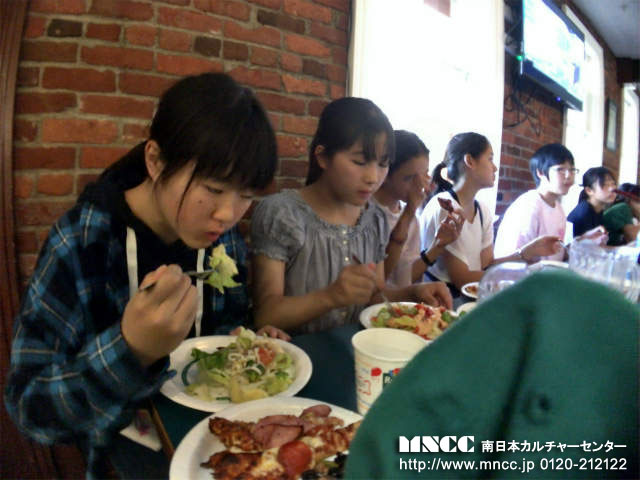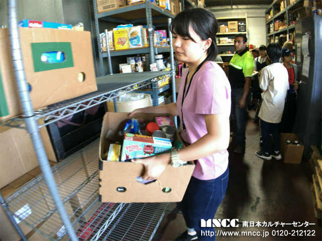 2名は無事交流活動(キャンプ)を終えてグループ活動に復帰しました。久しぶりの再会に24名みんなが喜んでいました。さて、今日の授業も質問から始まりました。最初の質問は、「The Mud Mill(昨日焼き物作りをしたところ)はどうでしたか。」でした。絵を書くのは苦手だが、楽しんで活動できたことやホストファミリーが気に入ってくれるといいなという気持ちを上手に話すことができました。また、昨日の欠席者は「キャンプはどうでしたか。」という質問に答えました。「レイク・タホ(とても大きな、海のような湖)でカヤックに乗りました。「こんにちは」などの日本語を教えました。」とうまく答えることができました。次は宿題の確認です。「ホストファミリーは運動(体を動かすこと)が好きですか。または自由な時間には何をすることが好きですか。」という質問に答えました。研修生は毎日出される宿題を通してホストファミリーとしっかりコミュケーションを取ることができるので、お互いのことを自然と理解することができます。とてもいい宿題だと思います。 Study Centerで1時間近く授業を受けた後、ボランティア活動を行うThe Salvation Armyに向かいました。予定ではThe Salvation Armyのバスが迎えに来ることになっていましたが、急遽バスが来れなくなりました。そのためキャシー先生とシンシア先生の車で送ってもらうことになりました。The Salvation Armyはその建物や、スタッフが着用している衣服の色など、白と赤を基調としていました。白と赤というと赤十字が連想されますが、双方ともに慈善団体ですので感覚的には近いものがあると思います。また、軍隊を模した組織をとって活動しています。そのため、スタッフは階級で呼ばれるようです(実際、最後に挨拶をしていただいた方は他のスタッフからキャプテンと呼ばれていました)。 さて、ボランティア活動の内容ですが、シリアル、缶詰、ゼリー、お米、スナック菓子などを袋やダンボール箱に詰める作業でした。このような食材は寄付されたお金で購入され、必要としている人に週1回程度配布されます。流れ作業でどんどん袋詰していきました。おそらく合計で100袋・箱以上詰めたと思います。9時半ごろから始めましたが2時間かかるかかからないほどで予定されていた分全てを完了しました。シンシア先生は過去数年アカデミックホームステイの研修生を受け入れてらっしゃって、毎年このボランティア活動を見ているそうですが、これまで見た中でも仕事がはやいチームだとおっしゃっていました。見ず知らずの中・高生が、集まってたった1周間ほどで素晴らしいチームワークを発揮することができたので、とてもうれしく思いました。ボランティア活動の後は施設の案内をしてもらいました。The Salvation Armyはキリスト教の布教活動も行っていますので、礼拝所などもありました。案内の後は、The Salvation Armyについて簡潔に説明したビデオを見ました。難しい単語が使われていたので少し難しかったようでした。 お昼ごはんは持参していましたが、The Salvation Armyの方からもご厚意でハンバーガーやフルーツをふるまっていただきました。ボランティア活動でお腹が空いていた私達は、用意してもらった昼食もありがたく頂きました。 昼食後の休憩時間にはキャシー先生とシンシア先生に教えてもらいながらHeads Up 7-Upというゲームをやりました。アメリカでは誰もが小さい頃に経験したことのある有名なゲームだそうです。ルールを説明します。6〜7名を除いた残りの人全員は顔を伏せて座ります。6〜7名は座っている誰かにタッチします。タッチされた人はその場に立って誰がタッチしたかを答えます。正解したら、今度はタッチする人になります。みんなで楽しめるゲームでしたので、ボランティア活動で疲れていた私達にとって、いい気分転換になりました。 その後、キャプテンからの挨拶を聞き、再びStudy Centerに戻って研修を行いました。ホストブラザーやシスターらは疲れてウトウトしていましたが、研修生は全員寝ずに頑張りました。授業の中で、絵を描いて単語の意味を説明する活動がありました。数名に描いてもらいましたが、それぞれが知恵を絞って、ちゃんと意味が伝わる素晴らしい(?)絵を描いていました(笑)。 明日は今週の目玉であるサクラメントへの終日研修です。ちなみにサクラメントは歴史のあるカリフォルニア州の州都です。明日はたくさん歩くことになると思いますので、研修生は今晩早めに寝ましょうね(でも、宿題は忘れずに)。それではまた明日!