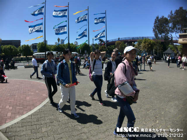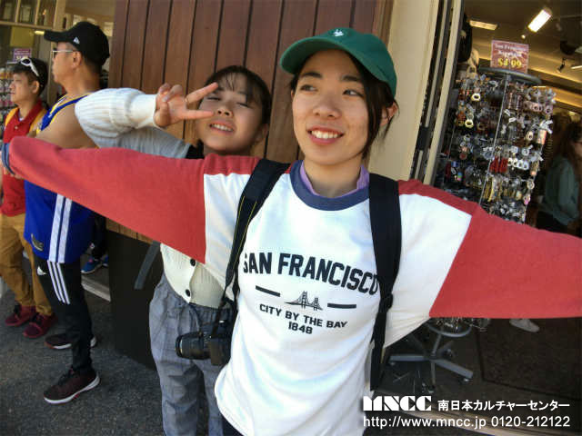 さあ、今日はサンフランシスコ終日研修です。24名の研修生、キャシー先生・シンシア先生とお2人の子ども達、そしてこの日の研修に参加を希望した数組のホストファミリー(と私)はワクワクしながら、世界でも有数の観光地であるサンフランシスコに向けて出発しました。 <ローダイ → サンフランシスコ> ジェリーベリー工場に行く時に通過した道を再び通りましたが、前回とは違い既に見ている景色のため、今日は写真を撮ろうとする研修生はゼロでした。バスはサンフランシスコに向けドンドン進みます。サンフランシスコが近づくにつれ、あたりは雲や霧に包まれてきました。私達の研修地ローダイでは、これまで全く雨が降らないどころか雲もほとんど見当たらなかったので、かなり気候の違いを感じました。研修生は昨夜早く寝たと思われ、体調を崩す者は1人もいません。 <ゴールデン・ゲート・ブリッジにて> バスに2時間以上揺られて、ようやくゴールデン・ゲート・ブリッジに到着しました。ゴールデン・ゲート・ブリッジ(金門橋)はアメリカ西海岸沿いにあります。すなわち太平洋に面しており、ゴールデン・ゲート海峡をまたいで南北をつなぐ大きな吊り橋です(瀬戸大橋をイメージしていただくと分かるかもしれません)。周りは霧に包まれており遠くの景色を見渡すことは難しいです。ローダイと10度以上気温が低いこともありますが、海から吹いてくる風の影響で体感温度がさらに低く感じられます。バスを降りるとさすがに長袖がないと厳しい状況でした。集合写真を撮った後、ゴールデン・ゲート・ブリッジに向けて歩き出します。 ゴールデン・ゲート・ブリッジの上は、橋を渡っている人と自転車でごった返していました。私達は2列で進んでいましたが、ちょっと広がっただけで後ろから来る自転車が「リンリン」とベルを鳴らします。時には笛を「ピー」っと鳴らす方もいらっしゃいました。多くの研修生はかつて世界一を誇ったこの吊り橋を写真に収めたいようでしたが、多くの人が行き交う中ではさすがに厳しいものがありました(残念)。時間も限られており、半分(体感的には3分の1くらい?)渡ったところで来た道を折り返してバスに戻りました。ちょっと物足りなさを感じましたが、橋の高さが60m以上あり、落ちたら命を落とす危険があったので、無事戻って来ることができただけで○(マル)だったと思います。 <Pier39自主行動> ゴールデン・ゲート・ブリッジでの研修を終えた後は、ピア39という、2階建ての桟橋にサンフランシスコ名物の食べ物を味わえるレストランや様々なお土産ショップが立ち並ぶ観光地(福岡のベイサイドプレイス博多のようなところだと思います)を訪れました。ピア39は周囲が海に面しており、海の向こうにはアルカトラズ島を眺めることができます。施設内ではメリーゴーランドやマジックショーなどのアトラクションもあり、何と野生のアシカも見ることができるのです!キャシー先生からいくつかの注意点と集合場所・時間の確認がなされた後、約5時間の自主行動がスタートしました。正直なところ5時間は長いかなあと思っていましたが、ランチを食べるお店を選ぶだけでも結構な時間がかかりました。そこからさらにいろんなお店を巡ったり、アトラクションやアシカ、サンフランシスコの素敵な景色を見たりしているとあっという間に5時間が経ってしまいました。 <サンフランシスコ → ローダイ> 夢のような時間が終わり、サンフランシスコからローダイに帰るバスに乗り込みました。車内ではホストブラザーやシスター達とトランプをして楽しんだり、研修生同士でいろんな話をしたりしていました。ワイワイ盛り上がる車内ではありましたが、何と、ピア39でゲットしたアイマスクとネックピローを身に着けて今日一日の疲れを癒やす研修生がいたのにはビックリでした!!(バッチリ写真に収めています笑)。8時過ぎにローダイのStudy Centerに到着し、たくさんのお土産を抱えた研修生はホストファミリーの車でそれぞれの家に帰っていきました。