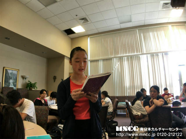 さあ、新しい1週間のスタートです。今日の報告をする前に、研修生がどんな週末を過ごしたのか、その一部を日記の中から紹介します。 〈日記1〉 日曜日は午前中教会に行きました。礼拝がありましたが、その中でホストマザーが私達のことを話しているのが分かりました。ホストファミリーがいつも私達のことを気にかけてくれて感謝の気持ちで一杯です。 〈日記2〉 土曜日の朝食はシリアルとマフィンを食べました。ホストマザーは買い物へ出ていたので1人で朝食を準備して食べました。お昼はパーティーに行きました。そこで会った私の1つ年下の子と仲良くなりたくさんしゃべりました。別れる時にはその子からハグして写真を撮ろうと言ってくれました。うれしかったです!! まだまだ紹介したいものはたくさんありますが、帰ってからのお楽しみということにしたいと思います。 <午前の活動1:授業> 今日は24名全員が揃いました。まず最初は、「(金曜日に訪問した)消防署や警察署のどのようなところが良かったですか。」(ホストファミリーとの交流活動で欠席した人には、交流活動はどうでしたか)という質問からスタートしました。それぞれがノートに4文ずつ書いた後に発表タイムです。しかし、シンシア先生が「だれか発表する人はいない?」と促しても、モジモジしてなかなか手が上がりません。アメリカ生活に随分慣れてきたはずなのに、いざ発表となると勇気が出ません。おそらく自分の英語に自信が無いのだろうと思います。アメリカ生活も折り返し地点を過ぎたので、もっと間違いを恐れずに発言して欲しいです。そのような雰囲気の中、必ず最初に手を上げて発表するのがYuiです。彼女の勇気に私達はいつも驚かされます。授業は今週の水曜と木曜の2回と来週の火曜日あと1回、合計残り3回です。あと3回のチャンスにみんながもっともっと積極的に発表してくれることを期待します! <午前の活動2:ボランティア活動の準備> キャシー先生から差し入れのドーナツをもらって一息ついた後に、水曜日の午後から行うボランティア活動(洗車をしたり、ガレージセール=日本から持参した物の販売を行ったりして、その収益をアメリカから日本へ留学したいと思っている人の奨学金に充てます)の準備をしました。その時に使うCAR WASH(洗車)という看板(目印?)作りでした。それぞれのテーブルで、ワイワイ楽しく作ります。どの看板も私の想像力をはるかに越える素晴らしいものが出来上がっていきます。今日は午後の活動のために折り紙を持ってきていたので、それをうまく使って、通りがかり人の目を引く立派なものに仕上がりました。若いって想像力豊かでうらやましい!! <午後の活動1:Reese Elementary School 訪問> ランチの後は近くのReeseという名前の小学校に訪問し、折り紙を教えました。日本の学校と違って周りはフェンスで囲まれており簡単には入れそうにありませんでした。そのフェンスをくぐり、教室に入ると小学生が私達を待っていました。簡単な自己紹介をした後に早速折り紙を教えます。最初は戸惑った様子でしたが、すぐに打ち解け、準備した折り紙を使っていろいろなものを一緒に作ることができました。キャシー先生が「終わりなので帰る準備をしてください。」とおっしゃった時は、小学生から「あおぉぉ↘↘↘(ええ、もう終わりなの?)」というため息が出ていました。折り紙大成功!!(お断り:許可が下りなかったため、小学生の顔が入った写真を撮ることができませんでした。活動の様子が伝わりづらく申し訳ありません。) <午後の活動2:授業> その後Study Centerに戻り、ホストブラザーやシスター(いない場合はホストファーザーやマザー)の学校について聞いてきた内容を紹介する授業でした。ホストファミリーの子ども達が通っている学校の始まる時間や終わる時間は、小学校、中学校、高校で少しずつ異なりますが概ね同じです。驚いたのは高校生であっても学校が終わる時間は3時より早いということでした。また、こちらの学校制度は(全てがそうではありませんが概ね)、中学校は2年間(日本の中1と中2)、高校は4年間(日本の中3から高3)だということが分かりました。また人数的に小学校の規模は日本とあまり変わらないようですが、中、高になるとこちらの方が多いようでした(日本でも学校によって人数が異なるので一概に比べることは難しいですが)。 さて、明日は今週の目玉のサンフランシスコ終日研修です。明日は長〜い一日になるので、キャシー先生も「9:30には寝ましょう!!」とおっしゃっていました。私も今日は早めに寝たいと思います!!