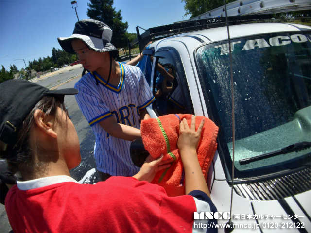<午前の活動1:授業> 昨日のサンフランシスコ終日研修の疲れは残っていましたが、今日も24名全員元気にスタートです。「サンフランシスコのどのようなところが好きでしたか。」「一番気に入ったところは何でしたか。」という質問に答えることからスタートしました。今日は全員の意見が聞きたいということで、一人ずつ順番に発表することになりました。みんな自分の準備した答えを何とか発表することができました。発表後、極度の緊張から開放され、その途端に力が抜けて「ドスッ」と椅子に座り込むある研修生の姿が印象的でした。よく頑張りました!!また、伝統行事についてホストファミリーに聞いてくる宿題の確認もありました。最近よく、「○○って表現であってますか?」とたずねられますが、正しくなくても考えや意図が伝わればコミュニケーションは成立です。テストだと間違いは許されないですが、コミュニケーションはそうではありません。研修生のそのような姿勢を見ると、改めて日本の英語教育の在り方について考えさせられます。反省です。 <午前の活動2:SAYONARA Partyについて> キャシー先生が「来週月曜のSAYONARA Party(さよならパーティー)でそれぞれ何をするのか?」とたずねられました。答えを言う際、先生に自分の考えが受け入れられるか不安で声がとても小さくなります。そうするとキャシー先生の声が一段と大きくなり、さらに不安になります。大丈夫です!日本でしっかり考えて準備してきたのですから、それを堂々と伝えましょう(その後、何とか全員のアイデアを確認することができました)!! <午後の活動:ボランティア活動> ランチの後はボランティア活動でした。キャシー先生とシンシア先生の車で近くのテンプル・バプティストという教会に移動し、そこの駐車場で洗車とガレージセールを行いました。私達が現地に到着した時は既にホストファミリーが洗車を受けるために来てくれていました。キャシー先生がホースで水をかけます。その後、洗剤をたっぷり泡立てたタオルを手に、研修生が車の汚れをドンドン落としていきます。キャシー先生が泡を洗い流したら、乾いたタオルで拭きます。次々とホストファミリーの車が到着し、洗車していきました。陽射しが強く非常に暑いので、体にかかる水しぶきがとても気持ちいいです。授業と違って体験活動はやっぱり楽しいです。決して楽な作業では無いのですが、研修生には晴れやかな笑顔が浮かびます。ホストファミリーの車をひと通り洗車してしまうと、洗う車が無くなってしましました。そこで、先日作ったCAR WASH(洗車)の表示の登場です。歩道に立ち、表示を高く掲げ、大きな声で「CAR WASH!!」と叫びます。笑顔を返してくれたり、手を振ったりしてくれますが、全然洗車を受けてくれる人がいません。呼び込みが成功しないと洗車ができません。これは困りました。ジャンプしたり大きく手を降ったりして目一杯「CAR WASH!!」と叫びます。5分、10分と経ちますが、車は1台もきません。そのうち呼び込みを手伝う研修生が一人またひとりと増えてきました。とても心強いです。その時、ローダイ警察のパトカーが見えました。「あ、先週の金曜日に訪れたローダイ警察のパトカーだ。もしかしたら洗車を受けてもらえるかも?!」と(勝手に)思い、さらに大きな声で叫びます。そうするとパトカーは駐車場に入ってきました!おそるおそる研修生がパトカーの方に駆け寄りますが、なぜか洗車を受けてくれません。キャシー先生が異変を感じ取り、パトカーに歩み寄り事情を確認されました。すると「近くで警察が仕事をしているので、CAR WASHの表示を止めてもらえませんか。」というお願いでした。これには研修生も(私も)大変がっかりでした。しかし神様は私達を見捨てません。その直後に、トラックに乗った2人の男性が洗車を受けに来てくれました(ホストファミリーの車ではありません!)。初めてのお客さんに研修生のテンションが上ります!洗車する手にも力が入ります。大勢でトラックをピッカピカに磨きあげました。その2人はガレージセールも覗いてくださり、ピカチュウの人形をお買い上げしていただきました!!しかし、これ以上呼び込みが出来なくなってしまったので、その後お客さんは1人も現れず終了の時間となってしまいました。そしてお迎えの車が続々とやってきました。せっかくなのでホストファミリーの車をピカピカに洗車しました。日頃お世話になっているお礼を洗車という形でお返しすることができました。本当によかったです!また、お迎えを待っている研修生でガレージセールの片付けをしましたが、気に入ったものがあったようで、その品物を買い取ってくれました。洗車やガレージセールのボランティア活動を通じ、お客をとることの難しさや、来ていただけることの有り難さと喜びを実感することができた今日の体験活動でした!本当にいい経験をすることができました!! さて、明日はローダイにあるTok