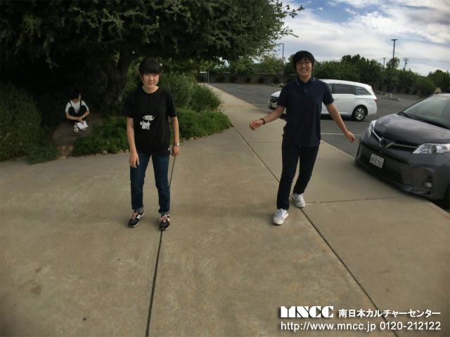 Miyuがホストファミリーとの交流活動で後から合流するため、今日は23名でのスタートでした。 <午前の活動1:授業> 「ホストファミリーとお別れする上でもっとも寂しくなることは何ですか。」という質問から授業は始まりました。Yui、Manaka、Saikaが次々と手を上げて質問に答えます。お2人の先生方が指名することなく、さっと手を挙げて答える彼女らに成長の「証」が見られます。とても嬉しいです!女の子たちはそれぞれヨットに乗った体験、ホストシスターと過ごした時間と答えていました。それに比べて、「ホストファミリーが飼っている犬」と答えたTakuroにキャシー先生からすかさず「犬だけ?ホストファミリーとの思い出は?」と鋭いツッコミが入ります。爆笑です!また、シンシア先生のお家にステイしていたAyaに、「Aya、シンシアとお別れするのが寂しい?」と(わざと?)質問されました。Ayaが答える前にシンシア先生が「もちろんよ!!」と返事されます。また爆笑です!! <午前の活動2:さよならパーティーの準備> 次は、さよならパーティーの準備でした。パーティーではピアノ演奏、日本の遊びの紹介、浴衣の着付けの紹介、ソーラン節、ダンス、クイズ形式の日本紹介、空手の実演、そして二人羽織の実演をやることになっています。二人羽織の実演はTakuroとKeishiで行いますが、何とお化粧をしてやるようです。さながらGeisha Boysといったところです。また、空手は女の子がやってくれます。こちらはKarate Girlsですね。今日は本番で実際に使うものを持ち込んで繰り返し練習することができました。どの演目も準備OKであとは月曜のリハーサルで最終確認するだけにの状態に仕上がってきています。楽しみです。そして、本番の演目が書かれたパンフレットの挿絵は、ManakaとMaiが描いてくれています。ローダイの名産品であるぶどうを描いていますが、ぶどうの一房ひとふさに、これまでの思い出のシーンが描かれていました。その中にキャシー先生とシンシア先生の似顔絵もありました。それを見つけたキャシー先生が「とってもかわいいわね!」と喜ばれました。シンシア先生がすかさず「本物のキャシーよりかわいいわね。」とジョークをおっしゃいます。息のピッタリ合った2人のやりとりにその場が和みます。 <お昼休み> 昼ごはんを食べ終わると、こちらにきて思うように体を動かすことができていなかったBoys達が前転の練習を始めました。運動神経抜群のTakuroがお手本を見せ、RyotaとShunがチャレンジします。Ryotaはすぐにできましたが、Shunはあと1歩というところまではできるのですが、何回チャレンジしても完璧にできるようにはなりません。そこにMiyuがやって来ました。Miyuも挑戦します。隣の学校で昼休みにバスケをしていたアメリカの中学生も興味を持ってこちらを見ていました。Miyuも前転できるようになりましたが、Shunはあと1歩でというところで時間が来てしまいました。うーん、残念(今日の活動が終わり、ホストファミリーのお迎えを待っている間もチャレンジしていました。よっぽど悔しかったのでしょう、、、)。 <午後の活動:さよならパーティーの準備> UiとMisatoはホストファミリーとレイク・タホで週末を過ごすため、早めにお迎えが来ました。残った22人は先日作った焼き物に添えるメッセージカードを書きます。さよならパーティーでホストファミリーに渡すためです。それぞれ趣向を凝らし、ホストファミリーへの感謝の気持ちを込めてカードを作っていました。そして、疲れた時はキャシー先生のジャザサイズで息抜きをしました。終了時刻を迎えるころには、色ペンや折り紙をうまく使い、溢れんばかりの思いが詰まったカードを完成させることができました。 今週もあっという間に過ぎてしまいました。楽しい時ほど時間の流れが早く感じられます。アメリカに来たのがまるで昨日のことのようです(とShunが日記に書いていました。本当に同感です!)。「このままアメリカに残りたい!」という言葉を何人もの研修生から聞きます。それほどまでこちらの生活に馴染んでいてとても嬉しいのですが、その分別れるのが一層辛くなりそうです。来週月曜のパーティーは、ハンカチいやバスタオルなしではいられなくなりそうな予感です。それではまた来週!!