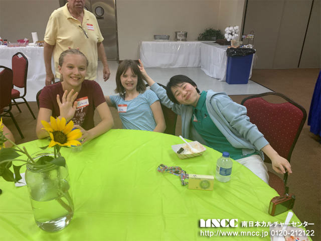 7月28日(日) 今日は,とっても暑い1日でした(最高気温は40度近くまであったそうです。あとから聞いても納得の暑さでした…)。午後6時半からウェルカムパーティーがありました。ホストファミリーと,コミュニケーションがとれているかな?と心配していましたが,たくさんの生徒が「楽しいです!」と笑顔。今日は一緒に料理をしたり,プールで泳いだりと,すっかり打ち解けたようで一安心です。ホストブラザーからおんぶをおねだりされる姿もあり,とても微笑ましかったです。パーティーでは,アイスクリームを食べ,簡単なインタビューゲームをしました。また,生徒たちが日本から持参したものを売るtrinket saleでは,扇子やけん玉などが人気で,パーティーのあとホストファミリーと一緒に遊ぶ人もいました。日本のものに興味をもってもらえると嬉しいですね♪私たちも,できるだけたくさんアメリカの文化に触れよう! 明日はいよいよ初めての研修があり,午後はウォルマートショッピングセンターに行く予定です。どんな研修になるのか楽しみです!