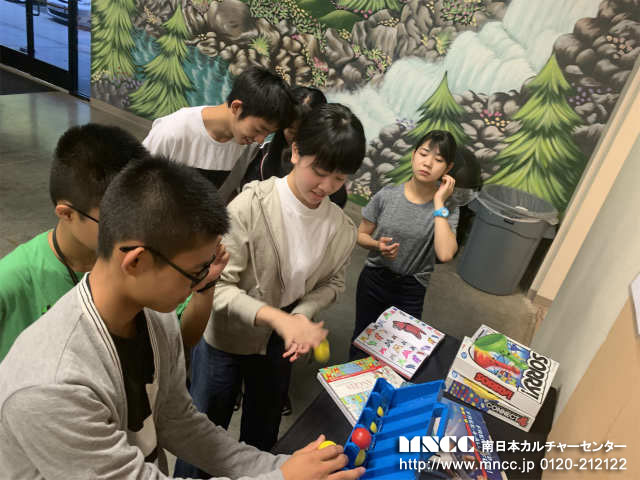 今日は,June先生からさいころを使った遊びを教えてもらいました。June先生は,このゲームをクリスマスに家族でするそうです。3つのさいころとコインを使った簡単なゲームでしたが,大盛り上がり!昨日のウォーターパークで疲れていた生徒たちも,みんな元気に遊んでいました。そして,勝者にはクッキーのプレゼントが♪楽しい午前中でしたね。 午後からは,ダウンタウンでペットショップ見学と”Scavenger Hunt”というゲームをしました。ペットショップには世界中から動物や魚が集まっており,大きなカメやイグアナなどを見ながら,動物園にいる気分になりました。詳しく説明してくれたり,エサやりを見せてくれたり,とっても親切な店主さんでした。”Scavenger Hunt”は宝探しのようなゲームで,「十字架の写真を撮る」「”kitchen”という単語を見つける」というようなミッションをクリアしていくものです。お店の人や,道を歩いている人に話しかける機会がありましたが,目を見て堂々と話せていましたね。Good job!ゴールのお店に着くと全員そろっていたので,どのグループが1位だったのかわかりませんでしたが…また1つ楽しい経験をすることができました^^ 明日と明後日は,さよならパーティーの準備が中心になります。今夜はスーツケースに荷物を詰めるというミッションもあり,帰る日がすぐそばまで来てしまったことをみんなで実感しています。残り2日も楽しもう!!
