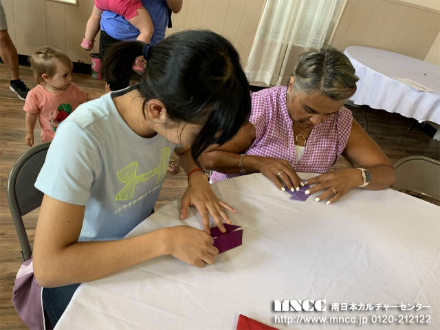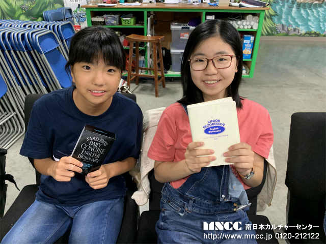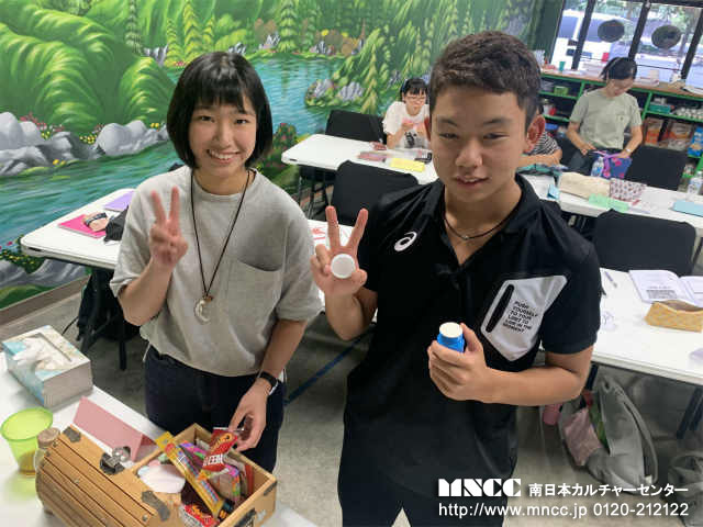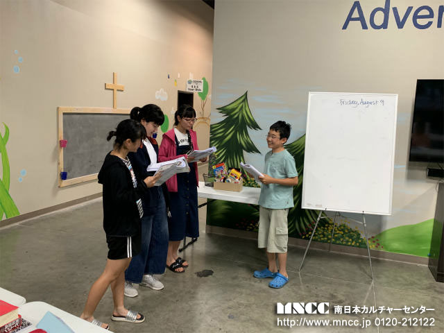 今日は“above(…の上に)”“beside(…のそばに)”といった,ものの場所を説明するときに使う単語を学習しました。生徒同士でも英語で説明し合ったり,授業に入ってくださったリニア先生に質問したりして,どんなときに使うのか確認していました。習った全ての単語は覚えられなかったかもしれませんが,少しずつ使えるようになってほしいと思います。研修の後半では,英語の歌に挑戦!「幸せなら手をたたこう」や,アメリカで野球観戦するときによく歌われる歌をJune先生に教えてもらって歌いました。家に帰っても,ホストファミリーとたくさん歌ってほしいです♪ お昼休みに看板を作って,いざユバサターフェアへ!折り紙ブースと書道ブースを用意して,それぞれ披露しました。(折り紙で作った手裏剣は好評で,「手裏剣をあげたらホストブラザーが喜んでくれました!」と日記で教えてくれた人もいました。中にはとてもファンシーな手裏剣を作る人もいます…!)書道は得意な人が多く,アメリカ人の名前を漢字で書いてあげて,喜んでもらえました。ブース他にも,食べ物やグッズの出店,空を飛んでいるような楽し~~いアトラクションがたくさんありました。時間の関係で少ししか外を回れなかったグループがあり残念でしたが,日本のお祭りのような雰囲気を楽しめたと思います。日差しが本当にとっても強かったですが,空の青色が鮮やかで良い1日でした! 今日は金曜日。明日からの2日間は,ホストファミリーと過ごす週末です。お出かけやちらし寿司作りなど,色んな予定があるようだったので,月曜日に話を聞くのを楽しみにしたいと思います。Have a nice weekend, everyone!