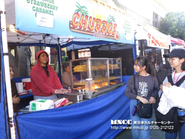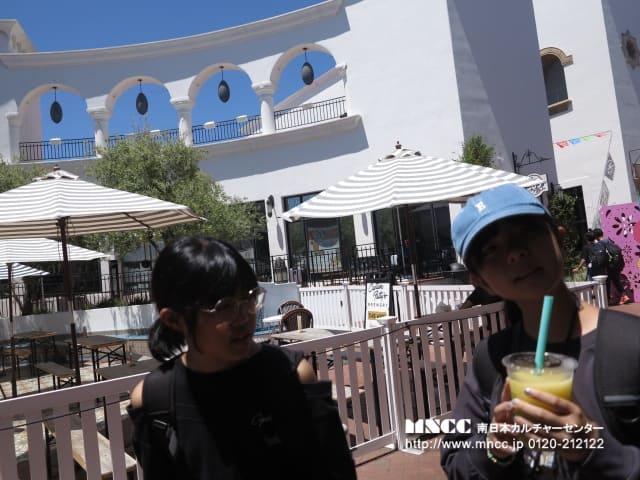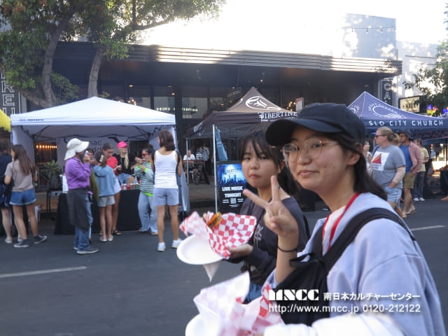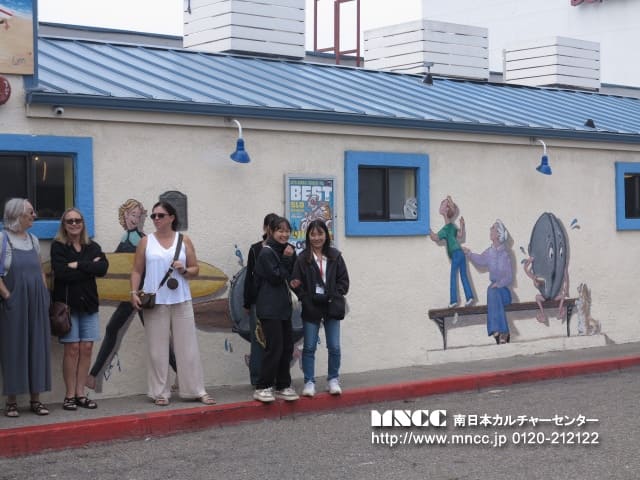 San Luis Obispoでは、1772年に建てられた教会を見学しました。十字架にかけられているキリストについて知らない生徒に対して友だちが優しく説明してくれる場面もありました。 教会見学の後は、Bubblegum Alley (壁に噛んだ後のチューイングガムが大量にくっつけられている壁)の見学。 実際に噛んだ後のガムなので、中には「気持ち悪〜い」と言っている生徒もいましたが、実際に噛んでくっつけて喜んでいました。ガムの壁の見学の後は、3時間ほどのフリータイム! ここでは、毎週木曜日の6時からFarmer’s Marketがあるとのことなので、それまで街を散策していました。 沖縄の家族へのお土産を選んでいる生徒やホストファミリーに買っていきたいと言う生徒もいました。 またまた女子のグループに帯同したのですが、現地の人に観光にオススメの場所を聞くミッションを与え、散策を楽しみました。 ここでもやはり、英語での質問やお店の店員さんとのやり取りができて自信がついてきたようです。ひまりさんは「沖縄から来た」と伝えられた! かほさんは「試食をしてもいいですか」と英語で聞けた!と報告してくれました!使える英語が増え、どんどんコミュニケーションの幅が広がるといいですね。 Obispoでは、夕食も食べておいでとミッションがあったので、Marketをぶらぶらしていると男子のグループを発見。 タコスのお店にりゅうとさんとはくさんが並んでいるので話を聞くと、思ったより美味しくて2回目並んでいるとのこと。 その堂々とした佇まいや店員さんとのよりとりがすっかり現地にいる人のようでした! Farmer’s Marketでは、ストリートミュージシャンが音楽を奏でたり、歌を歌ったり、ダンスを踊ったりしていて、沖縄では中々ない雰囲気だったので、もかさんと「沖縄にもこんなのあったらいいね〜」と話しながら歩いていました。 沖縄と海外の文化の違いに触れる良い機会になりました。