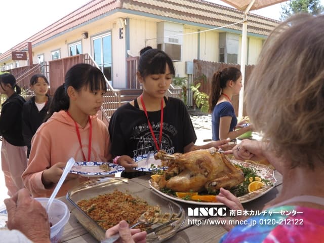 授業が終わると、持ってきたランチの他に、祝日にしか食べられないご馳走をホストファミリーがたくさん用意してくださいました!! Thanksgiving Dayで食べられる、ターキー、クランベリージャム、パンプキンパイ、キャセロールです。りゅうとさん、たいがさん、りゅうせいさんのホストマザーのCynthiaは昨晩からターキーとパンプキンパイを作ってくれたそうです。 そして、はつねさんと、かほさんのホストマザーがキャセロールを作ってくださり、全部美味しくいただきました!!何度もおかわりするぐらい美味しかったです☆そして、このThanksgiving Day のご馳走をいただく前にSusieが全員を輪にして、Thanksgiving Dayで何をするか教えてくれました。この日は感謝を伝える日で、いろんなものに感謝をします。「みんなは何に感謝したい?」と尋ねました。ゆなさんは「ホストファミリーとこのプログラムに参加させてくれた家族」、くららさんは「ホストファミリーと日本の家族と友達」りゅうとさんとせいだいさんは「ホストファミリー!理由は毎日ご飯を僕のために作ってくれる」とみんなそれぞれ感謝を英語で伝えていました!!この気持ちをいつまでも忘れないで欲しいですね!