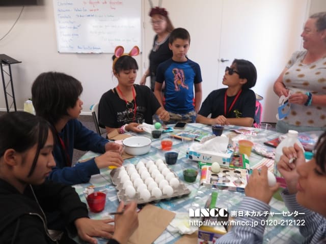 ランチの後は、アメリカの文化体験。ハロウィーンの仮装をし、トリックオアトリーティングを体験したり、クリスマスのデコレーションやバレンタインのカード作り、イースターエッグのカラーリングなど、沖縄では体験できないことにトライしていました! 特にイースターエッグのカラーリングは、卵を色のついた液体に浸し、色をつけるのですが、透明なクレヨンで模様を描くとそこに色がつかないので、いろんな模様の卵が出来上がり、楽しそうにやっていました! 卵を隠して探すところも体験させたかったのですが、できなかったのでちょっと残念でした。ですが、3月ごろに、お店に卵型のチョコレートが並ぶ理由がわかったと思います。そして、このイベントに合わせて、こはるさんがみんなにプレゼントを準備してくれたそうです!前日にホストマザーとラッピングをしてそれぞれの名前を可愛くデコレーションして渡していました!みんな喜んでいました!誰かのために何かする (今回のプレゼントだけだなく、一緒にバレーしようと誘ったり、バスのトイレを使うために座席を工夫したり、体調悪そうな子に声をかけたり、たくさん!)という優しさが毎日見れてほっこりしています♡