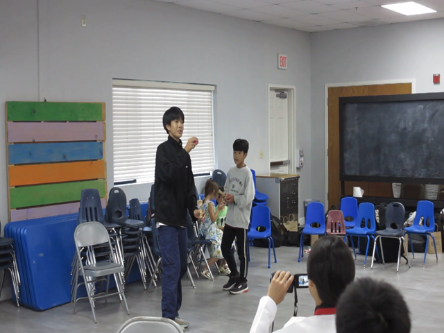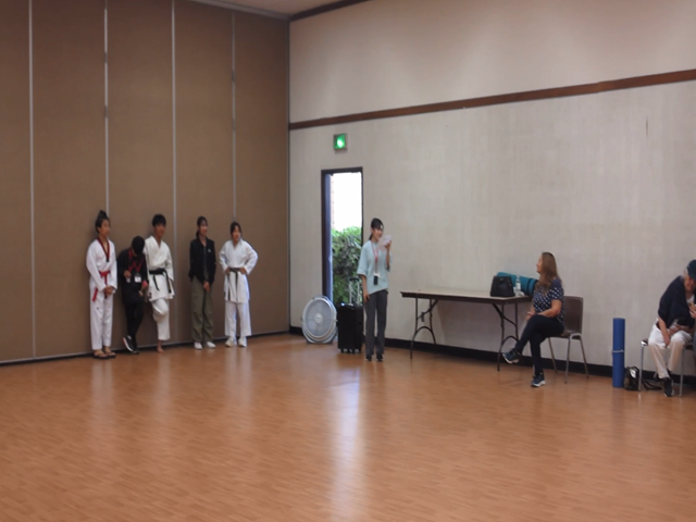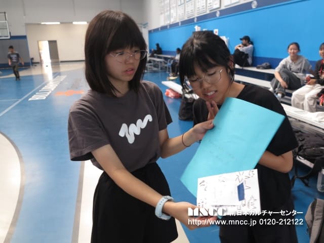 スナックタイム後の授業は時間をもらって、来週火曜日の老人ホーム訪問で教える日本・沖縄文化の紹介練習をしました。 人数が多いので、2つのグループに分かれ、最初に老人ホームに行くメンバー(A班)と授業後に行くメンバー(B班)を分けました。 A班は、折り紙と空手&テコンドーを教えたり、披露します。B班は、書道と茶道を教えたり、披露します。それぞれ、自分の得意な分野に分かれました。折り紙を教える生徒たちは、披露する折り紙は何か、教える折り紙は何か考え、それを英語にしていました。空手&テコンドーは、英語での説明や、何の形を披露するか考えていました。小さい時から習っている生徒がたくさんいて、1人で得意な形を披露したり、2人で披露したり、最後には全員で披露するそうです。書道の班は、書道でおじいちゃん、おばあちゃんの名前を漢字で書いてくれるそうです。書道セットを持ってきている生徒もいて本格的な書道を披露することができそうです。茶道の班は、実際にお茶をたてながら、別の生徒が英語で説明をするそうです。 実際に試飲もさせるとのことなので、役割分担を細かく分けていました!!どのグループも英語での司会の準備もバッチリ!当日、恥ずかしがらずに、堂々と自分たちの文化を披露できるといいですね。