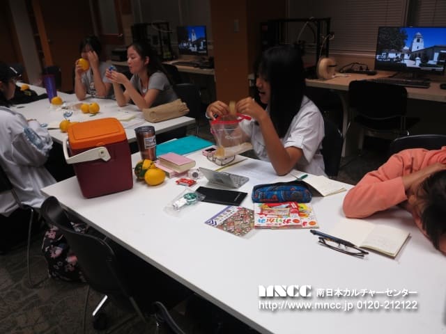 今日は、「レモネードスタンドの日♪」の予定だったのですが、市から飲食物を道で販売する許可が下りず (コロナ以降厳しくなっているとのことでした。)、レモネードスタンドは中止になりました(T . T) 私も聞かされたのが、前日の夜のメッセージで、生徒たちは当日の朝に知りましました。 こはるさんとゆりなさんは、ファミリーのお家で植えられているレモンを持ってきてくれたり、生徒たちは、日本から今日販売するために持ってきたものを準備していたのでとても残念がっていました。 日本から持ってきたものは、さよならパーティで使う予定なので無駄にならなくてすみそうです。 2人が持ってきてくれた大量のレモンは、「週末にファミリーとレモネードを作る」という課題が出され、全員で分けました。生徒たちはレモネードを作ることは初めてなのでどんな風に出来上がったのかチェックするのが楽しみです。