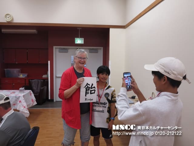 A班とB班を交代し、B班(書道と茶道)がやってきました。B班が来る前に、シニアの方々は他のアクティビティがあったため、そこに参加することになり、書道と茶道の方にはあまり人が来なかったのですが、活動に参加したシニアの方々はとても喜んでいました。 スタッフの方にお願いをしてゲームに参加している人に声をかけてもらったのですが、ゲームはグループで行うものだったので、中断をして活動に参加してもらうことはできませんでした。 しかし、ここみさんとひろとさんがそのゲームをしている輪の中に行き、実際に書いた書道を持って、「あなたの名前をこんなふうに漢字で書くよ」と伝えると「私の名前を書いて!」と言ってくれる人がいるので、名前を尋ねていました。名前が「キャンディー」だったので、書道チームで、音を漢字に当てはめるか、意味を漢字に当てはめるか考え、「飴」という文字をはくさんが書いてくれました!本人はとても気に入り、はくさんと写真を取っていました!!それを見て、私のも書いてとお願いする人が増え、たくさんのシニアの方々の名前を書道で書いていました。中には、家族の名前も書いてほしいとお願いする人もいました!!茶道チームは、くららさんが、「ねりきり」という和菓子も作って準備してくれ、立てたお茶と一緒にシニアの方々は楽しんでいました。茶道は沖縄でもなかなか体験できないので、私たちもとても興味深かったです。今日の経験を活かしてさよならパーティーも成功させたいと思います。