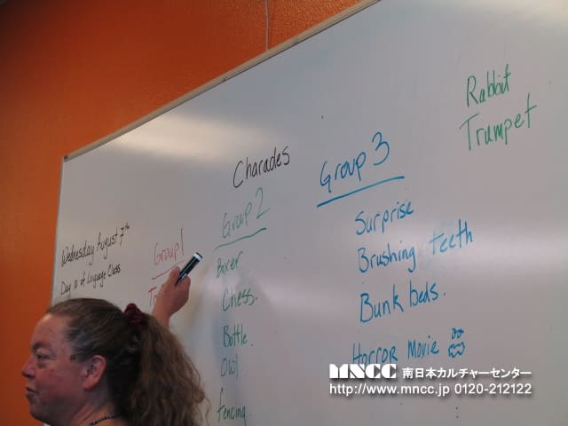 午後は、Culture Exchangeとして、お互いの国のゲームを紹介する予定でしたが、アメリカの2つのゲームを紹介してもらい終了しました。 アメリカのゲームは、”Boggle”と”Charade”です。”Boggle”は単語遊びのゲームで、16マスの中にあるアルファベットを繋げて単語を見つけるゲームです。 3文字以上のアルファベットを繋ぐというルールや、隣を飛び越してはいけないというルールがありました。みんなで47個の単語を見つけることができました!!アメリカの子どもたちは、このようなゲームで単語のスペリングを覚えていくんですね。”Charade”は日本でいうジェスチャーゲームです。英語で行いましたが、結構答えられる人がたくさんいて驚きました。日本のゲームを紹介することはできませんでしたが、日本の遊びに目を向けて英語で説明を考えることができたチームもあったので、良い勉強になりました。 アメリカにはボードゲームがたくさんあるので、各ホストファミリーのお家で挑戦している生徒もたくさんいるようです。