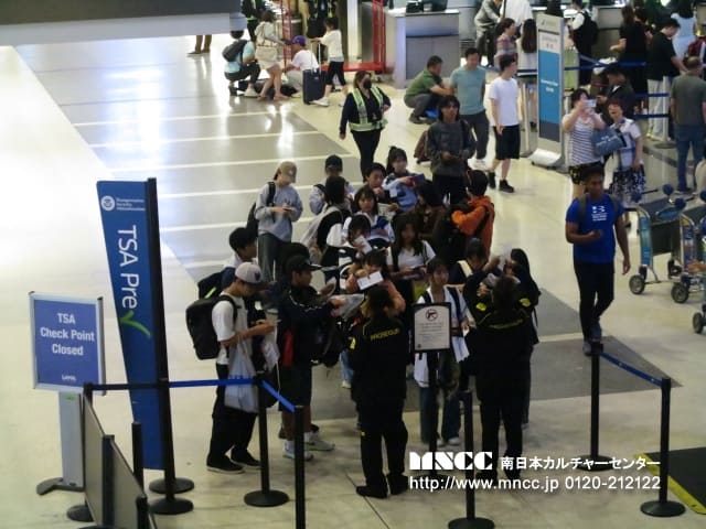 バスで4時間ほどかけLAXに到着。ここで3週間お世話になったTCのHaidiとSusieとはお別れです。 最後にお礼を言って空港に入りました。空港に入ってすぐにChina Airlinesのチェックインカウンターに行き、手続きを行いました。 全員スムーズに手続きを終え、保安検査場に向かいました。保安検査場では、私がパソコンをカバンに入れたまま通り、怒られ、何名かの生徒はお水をカバンに入れたままで通ったので、お水をとられました。それ以外にアクシデントもなく、全員通過できました! 搭乗時刻まで1時間半ほど時間があったので、アメリカでの最後のショッピングを楽しんでもらおうと、集合時間と搭乗ゲートの場所を確認し、フリータイムにしました! スタバのタンブラーやカリフォルニアのキーホルダー、お土産用のチョコレートなどを買い、全員時間内に帰ってきました!