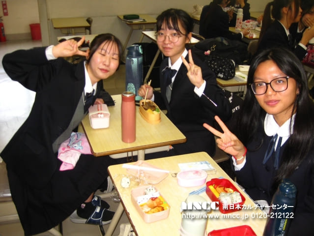Today was my second day at Kajiki Middle School! For breakfast today I ate kimchi, eggs, rice, and ham! So yumm. Today there was a student council assembly so Nagomi and I rushed to school by car. Nagomi is apart of the student council by the way!!! It was being held in the gym and I helped set up a little bit! The assembly started a little after and it lasted around 25 minutes. It was about sitting properly, putting shoes away properly, neatly putting away backpack, and a lot of other stuff. First period today was Japanese. They were learning kanji and sentence structures. This class felt sooo long!! Second period was art! Students seemed to be making printed artwork(?). Since this would be my only art class here, the teacher let me draw whatever I wanted. So I drew him a vase full of flowers! It was a little embarrassing as it looked so messy and the shading wasn’t finished. But I tried my best with the time I had! Third period was History. I tried my best to keep up with the notes and got half a worksheet filled out! It’s hard to see from where I sit so I wasn’t able to finish. Then fourth period was English. We prepared for the India Exchange and practiced for a test. The India Exchange will be tomorrow and it is where we and students from India will quiz each other. It’s a competition! Then it was lunch!!! Today I was so happy. We ate a 春巻き!!! The filling was different from a usual eggroll, but it was good! However, my favorite from today’s lunch was the パン!!!! It was so good I love bread!!! There was also soup which reminded me of a Lao dish. Today’s lunch really reminded me of home! During lunch break I hung out with Yukina. We drew together! And then it was cleaning time. We moved desks, swept floors, and wiped the floors. My friend Hartarou was doing it so fast it was so funny! I actually can’t remember was fifth period was…..oops! But sixth period was really fun!! We played this tag game and went against another class. It was so fun but the rules were so confusing. Unfortunately my class lost. After school I went and toured all the clubs with my friends Oka, Rei, Yui, Misaki, and Yamakou! It was so fun. My favorite club I saw was Tennis. Then Nagomi and I went home! Today for dinner my host mom made Larb!!! Which is a traditional Lao dish. I was so happy!!! And everyone loved it which made me even more happier!!! Then for dessert I ate matcha chocolate and a red bean filled mochi! It was delicious!! My host dad bought the matcha and mochi because I was talking about it the other day. How kind!!