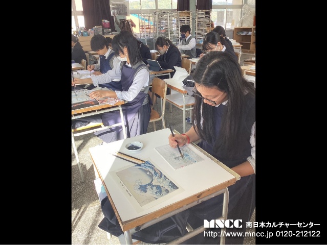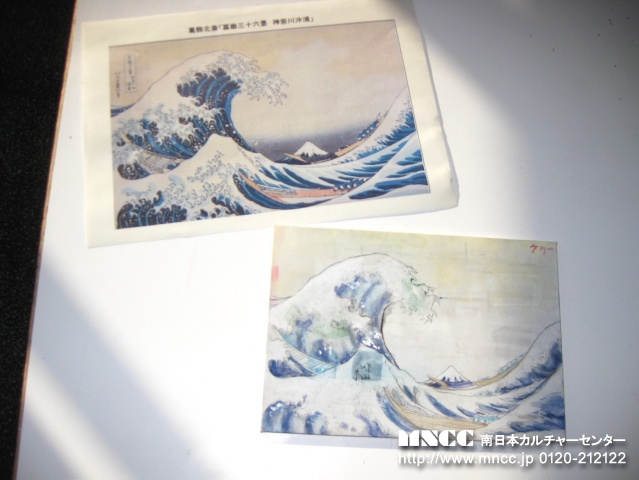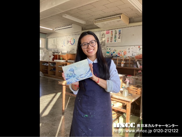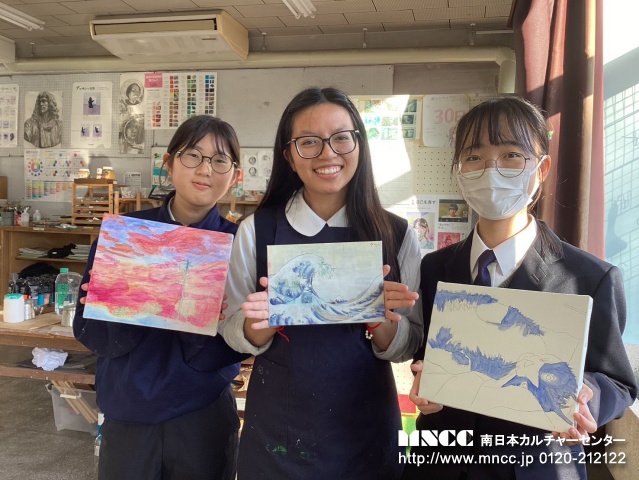 Today was my fourth day at Kajiki High school! For breakfast I ate kimchi and rice! I love kimchi!!! Then we were on our way to school! First period today was Japanese. They were taking a test so I couldn’t really do anything. But I came prepared a brought a book! The book I brought was “Frankenstein”. Super interesting!! After class ended Ms. Yacco came by! What a nice suprise! She came and took some pictures and left. Second period was Math and it was another day of fun! We did the same thing as yesterday and I really liked it. Drawing graphs!! It kind of makes me miss my math class in America! Third period was English. The english teacher gave me this long worksheet and it took me a while to understand what to do. There were barely any directions… I was so confused! Fourth period was Geography and History. I didn’t understand what was going on again as everything was in Japanese, so I just read my book again. And then it was lunch!!!! I love lunch. I also had a lot of fun eating with Shiori. Today my bento was so delicious! My host mom is an amazing cook! And she packed me a lot of strawberries, I was so happy. After I finished eating, I started my mission of making new friends! Mason also came by and helped me. I passed out American candy and everyone seemed to like it! Fifth and Sixth period was Art. It was so fun I love the atmosphere. It’s so different compared to my art class in America. Very peaceful! The art teacher let me paint her drawing of Katsushika Hokusai’s famous painting, “The Great Wave off Kanagawa”. It was so much fun! I did the traditional way of making paint by crushing the pigment and adding a solution (oil?). Next was Seventh period and they talked about their school trip. I’m so jealous!! I wish I could go too. When school ended I wet on another club tour! Today I went with Mason, Airi, Mio, Yuka, and Yua! It was so much fun!! Before we went on our tour we went to Family Mart. I bought a pudding ice cream, melon pan, and gundam! I bought gundam because my brother’s birthday is soon and he loves gundam! Then we walked back to school and ate our snacks while watching soccer practice. Then we went to volleyball outside and Mason played with them. They looked like they were having a lot of fun! After we watched kendo, basketball, badminton, and table tennis. Then we went to rock band club and they are so cool!!! At 6:00pm I rushed to brass band club and met up with Shiori. Then we went home! I had such a fun day today! I’m so sad that tomorrow is my last day! I feel like i’m just settling in.