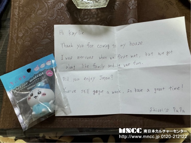 Today was my last day at Kajiki!!! I’m so sad. For breakfast I ate melon pan!! It was so delicious! Then I went it was time for school. First period was Mathematics! We did the same thing again and it was fun. Before class, Shiori had to solve a problem and I got to help. Second period was Biology. I love biology! The teacher gave me one of their tests, but instead of doing it I wrote kanji! It wasn’t very pretty but I tried my best. Third period was English again and they were translating sentences into English. One of the sentences was “My dog shiro got hit by a car and broke his leg” it surprised me so much. Fourth period was Civics and we watched more news videos. I read “Frankenstein” while they did their work. Then it was lunch!!! Today I eat with Shiori, Fumie, Airi, Yua, and Mio! I was so happy. And they all surprised me with Japanese snacks!! I was so happy they are all so kind. When it was cleaning time we talked a lot. We talked about Grent Perez (singer) and how they wanted to go to karaoke with me. Im so sad I wish I could go! Fifth period was Geography and History and I was so confused! So I read my book again. Sixth period was Information Study and we played kahoot! However, it was more like a quiz so I didn’t really know what to do. But I tried my best and partnered up with Shiori. Sixth period was Japanese Language. However, Ito Sensei (sorry if I misspelled!!) bought origami!!! So instead of doing work my classmates made me origami!! I was so happy and honored, he and my classmates are so kind! And he gave me candy, kagami mochi, and shimekazari! Im so grateful! My classmates are so talented they made me a backpack, ribbon, crane, hearts, flowers, a lei, shuriken, and so much more! A group of boys made me a huge one and it was so funny! After, I gave a short speech and then we took a class photo. I couldn’t hold it in anymore and started crying! It was a little embarrassing but I was so sad. I’m going to miss everyone so much! Then I took pictures with a lot of friends and then exchanged Instagram accounts! I said bye to some teachers as well! Then I hurried home as my host family and I were going shopping! I bought hachiware stuff and souvenirs for friends and family. I also bought some clothes! We ended the shopping with PURIKURA! It’s so funny. Then we went to Jolly Pasta to celebrate Yuka’s birthday! She is now 13. We went home and ate delicious cake as well. I bought Yuka a blue necklace and she seemed to really like it. I was happy! Then we played one round of Uno. Today was so much fun and I’m so happy to have made so many memories at Kajiki and with the Sabetto family. They are so wonderful!