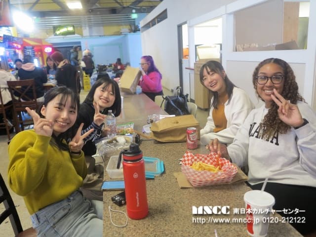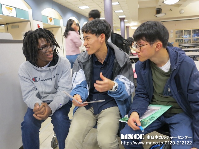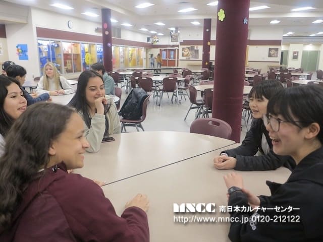 授業が終わり、生徒達がバディーに連れられてカフェテリアに集まってきた。 今日はスケジュールは変更になり、ここでアメリカ人の生徒とランチを食べることはできなかった。今日は学校が早く終わる日だったようだ。彼らとの別れを惜しむ日本語クラスの生徒達。インスタ、メールなどをお互い交換して写真やビデオを撮ったりしていた。ここで予め持参していたMNCCのジャパンホームステイのチラシを葉子先生に渡し、是非このクラスの生徒たちにも案内をしてほしいと伝えると大変興味を示された。生徒達にもこのことを伝えると是非トライしたいという子達がたくさんいたことは嬉しかった。日本語クラスを持つ高校が他にもあるということで、そのチラシをまたコピーして持って行こうということになった。