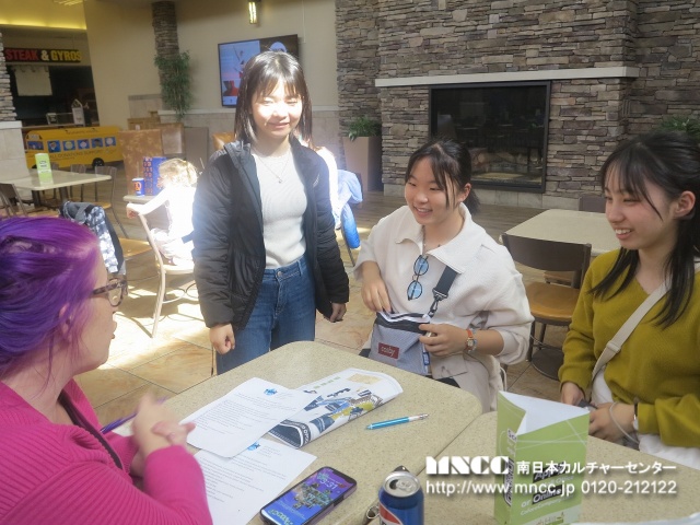 午後は、モールでのスカベンジャーハントをする。3人1組で5つのグループに分かれて、クリス先生からお題の用紙をいただく。 そこに書かれてあるものや、イメージするものをモール内で探して写真を撮ってくると言うものである。アメリカではよくあるゲームである。フードコートでクリス先生が待っているので、もしわからないことがあれば聞きに来るようにと言われた。例えば’Coffee company that started in Seattle’ シアトル発祥のコーヒーの会社は? これは簡単みんなが知っているスターバックス。このように、答えが決まっているものもあれば、’If I could buy anything no matter the cost I would buy...’ どんなにお金がかかってももし買えるものなら買いたいと思うものや、’Somewhere I could spend all day’ 丸一日でも過ごせる場所など人によっては答えが色々あるようなお題が15問ほどあったが、中には理解できないものもあり、道行く人を呼び止めたり、お店の人にも聞いたり、クリス先生に聞きにきたり、みんな協力し合い頑張っていた。