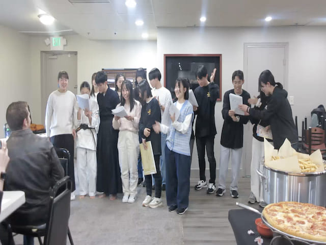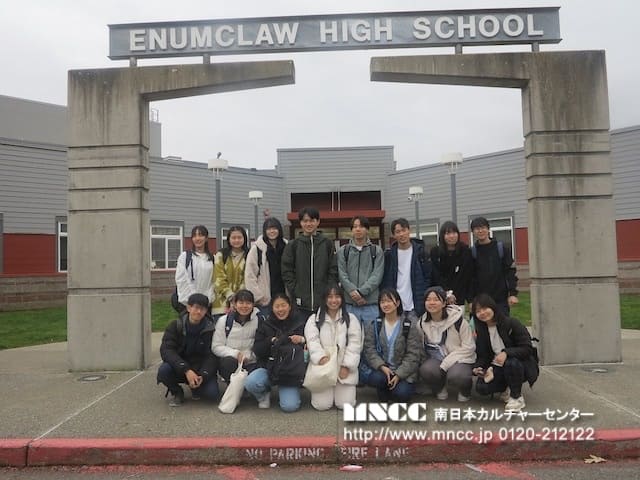 アメリカで過ごす最後の日。今日のスケジュールはみっちりとつまっていてとても忙しい!今日は全てのスケジュールをこなしてそのまま帰国の途につくため、みんな朝にはスーツケースをもっての出発である。 ホストファミリーが空港へ連れて行く生徒以外は、クリス先生の息子さんの車にスーツケースを持って行ってもらい、いつものようにクリス先生の運転するバンに乗り込む。最後に行く学校はEnumclaw高校。 車で約30分。ここはマンモス校で、校舎も最近リニューアルしたようでとても施設が整ったきれいな学校であった。校舎内に入ると、女性の先生が温かく出迎えてくれた。 ここでもグループに分かれて、アメリカ人のバディが校内の施設や授業を行っている教室に案内してくれた。アメリカの高校の科目は非常に多く、必修科目以外にも選択科目がかなりたくさんある。 家庭科のクラスには調味料から調理器具、冷蔵庫など、全てものが揃っていて、巨大な”キッチンクラス”である。農業関連のクラスは、屋外の子ヤギがたくさんいる場所へ。 生徒達のカバンに嚙みつこうとする姿に生徒達も苦笑い。音楽室、本格的なシアタールーム、カメラ撮影室、吹奏楽部の教室、化学や物理実験室、スペイン語のクラスなど、どこも広く、施設や設備が大変充実している様子がうかがえる。 そういえば、ここはワシントン州でシアトルマリナーズの本拠地。あるクラスでは、イチローの人形があった。今は大谷翔平のニュースで持ち切りではあるが、ここで大谷翔平のことを話す人はあまりいない。 私のホストファザーは名前すら知らなかった。マザーが「あのすごい契約金でドジャーズと契約した人よ」と言ってもピンときていないほど。(笑)イチローのことを話題にする人はまだここには多いようである。