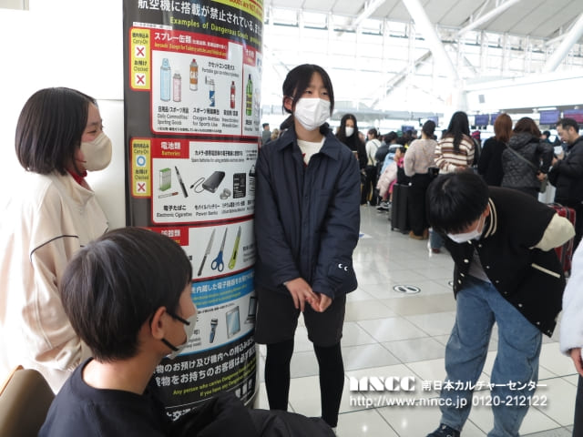 12:30に福岡空港3F、Mカウンター付近に集合・・・とのことでしたが、比較的早目にみなさん集まってくれました。軽く自己紹介をして、福島さんの注意事項を聞いてチェックインカウンターへ。ステイ先の住所を聞かれて少し時間がかかった人もいたけれど、なんとかクリア☆大きなスーツケースを預けてからは、みんな身軽にゲートを通過していきました。(最後、見送ってくれていた福島さんに振り向いて手を振ったのは私だけだったかも?!笑)