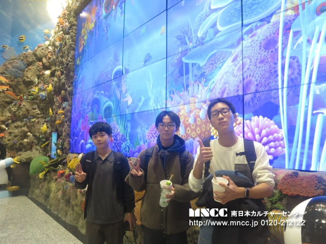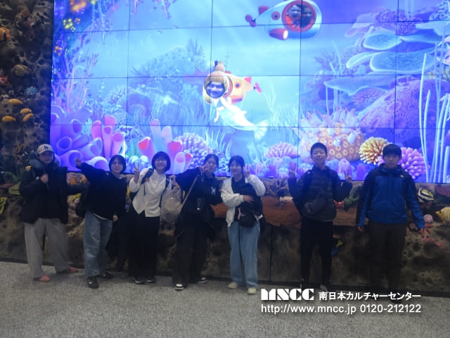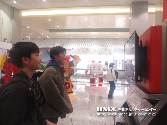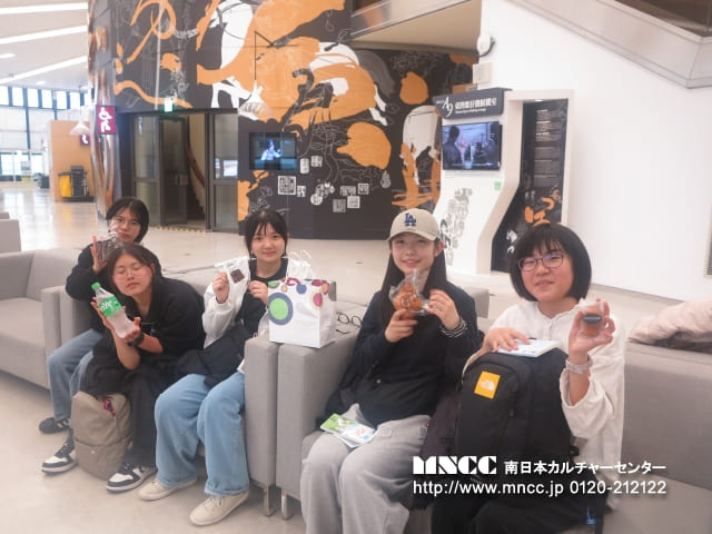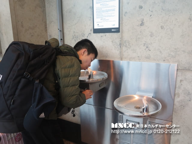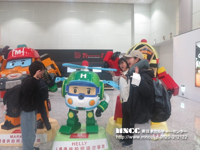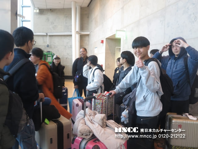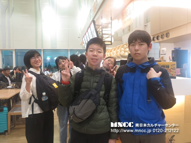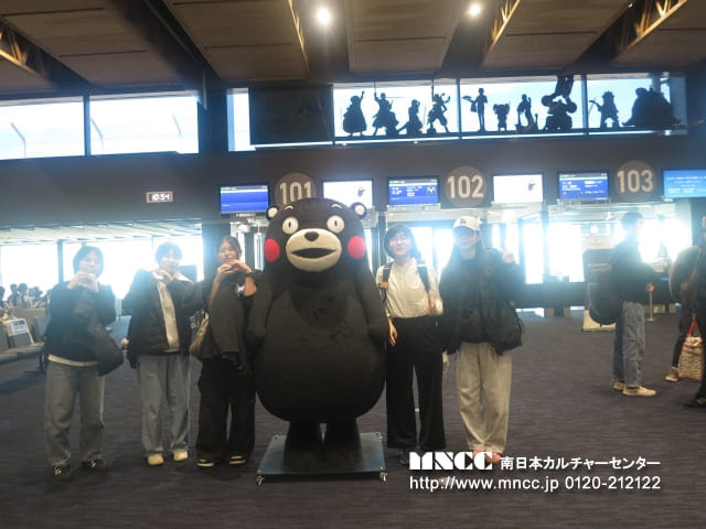 保安検査前では、100mlを超える液体を機内に持ち込めないため、事前に購入していたペットボトルを廃棄する必要がありました。まだ飲んでいない飲み物を捨てるという経験は初めてで、「もったいない」と感じた生徒も多かったと思いますが、これも飛行機を利用する上での大切な学びの一つです。また、保安検査では両腕を上げて体の形に沿ったチェックを受けるなど、日本とは少し異なる方法に驚きながらも、無事に通過することができました。きっとこの経験も、今後ホストファミリーとの会話の一つになることでしょう。搭乗ゲート前では時間に余裕があったため、あえて全員でゆっくり会話を楽しむ時間を取りました。また、集合写真の練習として、「くまモン」を囲んで撮影を行いました。今後も人数確認の一環として、並び順を固定しながら集合写真を撮影していく予定です。搭乗前には、生徒の一人が”Exciting!”(「とてもワクワクしている」)と目を輝かせながら話してくれました。これから始まるホームステイ生活が、一つひとつ新しく、心温まる体験となることを願っています。