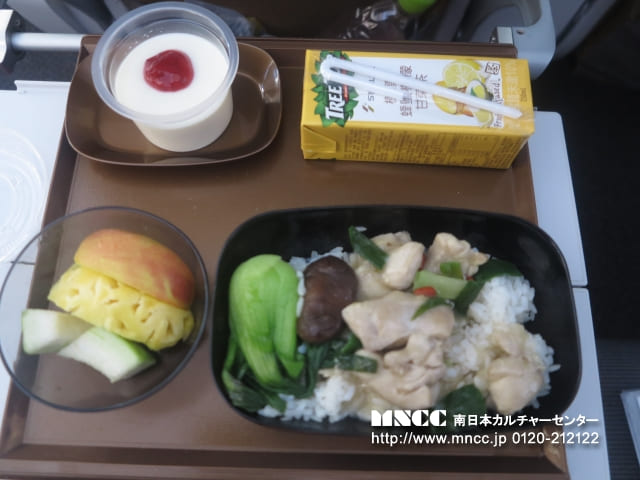 機内はかなり狭く混んでいて、窮屈になりそうな11時間のフライトでした。 機内では2時間後に夕飯が提供されました。機内の夕飯は、アメリカ牛を使った牛丼またはタンドリーチキンのどちらか選択。機内ではそれぞれ時差ぼけ防止のためにしっかり睡眠をとってくれました。また機内では英語を使うチャンスがいっぱいのはずだったんですが、ブライトアテンダントが日本語が使えるので、意外と英語を話す機会がありませんでした。中学生がトイレットペーパーが切れたことを伝えたいと英語を聞いてきたり、トイレを譲ってもらったときに聞こえた単語を教えてくれたり、また夕飯に提供されたアイスクリームの残りが上着に落ちて濡れた生徒もいました。そのことをステイ先の家族に早速伝えないといけないので、どんなふうに言ったらいいかを練習したりしました。いろいろな経験を英語に置き換えて、英語力も磨いていきたいです。