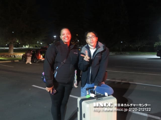 生徒の皆さんは無事にホストファミリーと対面し、遅い夕飯とり、今頃はゆっくり休んでいることと願います。私たちは今から2時間前の22時過ぎにオークハーバーに到着いたしました。シアトル空港からバスでノンストップのドライブでした。到着時にはすっかり日も暮れており、ホストファミリーの皆様にはお待ちいただいた中での対面となりました。暗く寒い中で、身体的にも大変な状況ではありましたが、生徒たちは全員笑顔で元気よく、初めてのご挨拶を英語で交わしておりました。入国審査が想定以上に時間を要し、お迎えに来てくださっていたTCのタニーシャ先生には、シアトル空港で約4時間もお待ちいただくこととなりました。自ら積極的にタニーシャ先生に話す姿が見れて喜ばしいでした。先生からバス乗車前にサプライズでアメリカのお菓子をいただきました。長時間の移動の合間に、生徒たちはおやつを楽しんでいたようです。なお、ファミリーと対面時に1点ハプニングがございました。