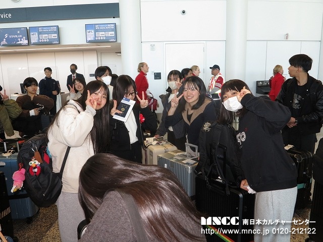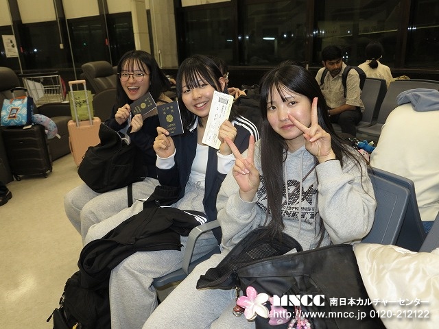 一日中雨だった昨日から、今朝は一転晴れ渡り、空港へ向かう朝日が眩いほどであった。集合時間は、早朝7時15分、バス出発は7時30分。この15分で様々なチェックや注意事項を終わらせるためには、皆さんの協力が必要だ。現在の鹿児島空港駐車場の混雑問題を話していたため、全員が時間に余裕を持って来てくれた。私は職業柄か、生徒のスーツケースを持つと、重量オーバーしているか否かが瞬時にわかる自称歩くスケールだ。しかし今日は、何人かのスーツケースが微妙に超えているかギリギリOKかどうかがわからなかった。空港内での集合ならば、カウンターで量れるのだが…と思っていたところに、なんとケンシロウが小型の荷物のスケール機器なるものを持ってきていた。こんなものがあるのか、と感心しながら見ていると、案の定二人が重量オーバー。その場で荷物を取り出してもらった。ありがとうケンシロウ!